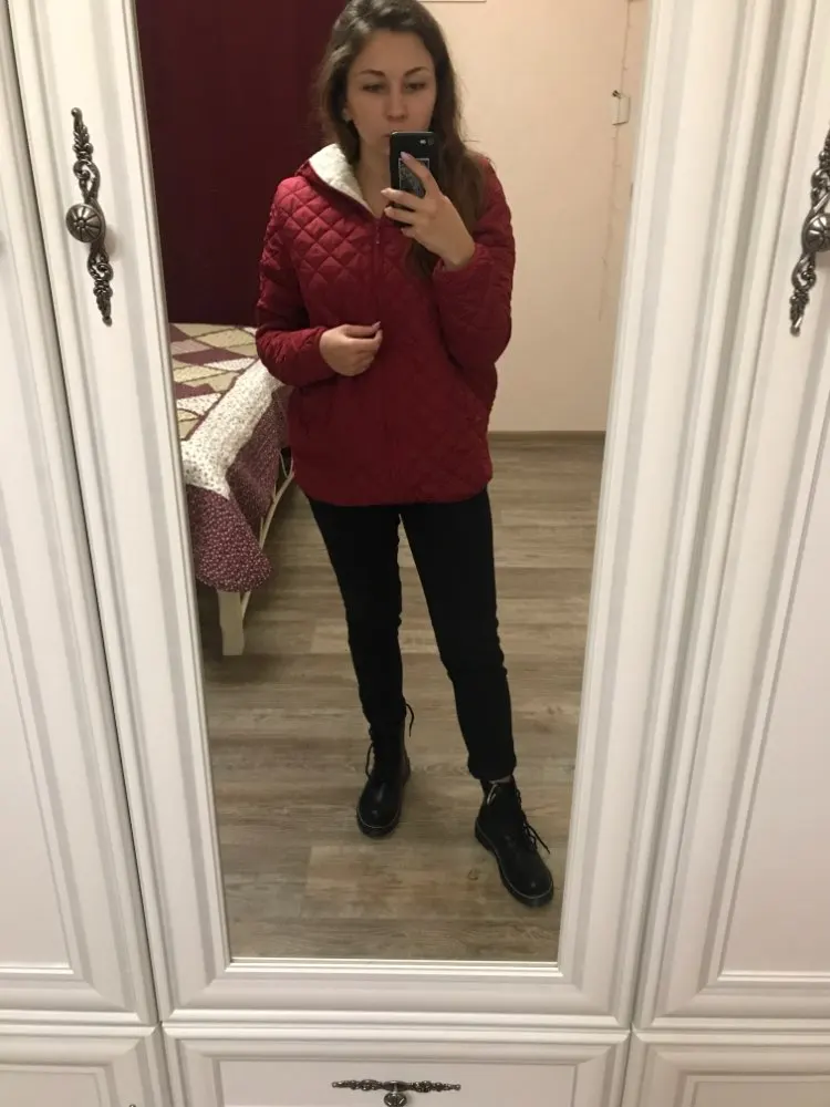 Куртка выглядит как на модели. Отличный красный цвет, длина по середину попы, рукав длинный, не подстреленый. На параметры 95-80-105 взяла XXL. Села очень хорошо, но у меня спинка узкая, а грудь большая, поэтому чуток спереди жмёт, если руки развести. Мех внутри довольно тонкий, но думаю на 10-15° тепла с кофтой будет очень неплохо. Капюшон мелкий, обладательницам пышной причёски даже до лба не дойдёт. Зато шею прикрывает отлично, у куртки очень высокая молния, шею 32см облегает, влезет только тонкий газовый шарфик. Вещь отличная за свои деньги, качество высокое. Очень рекомендую. Дошла до Ростова за 2 недели.