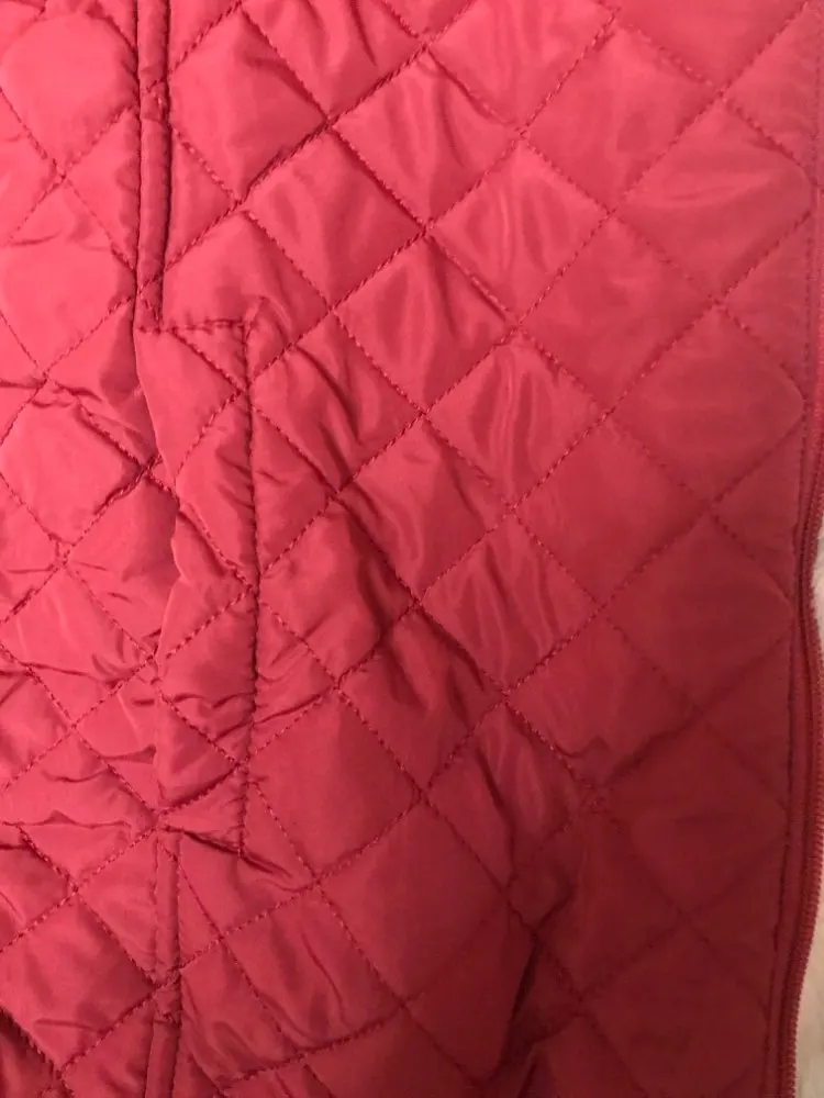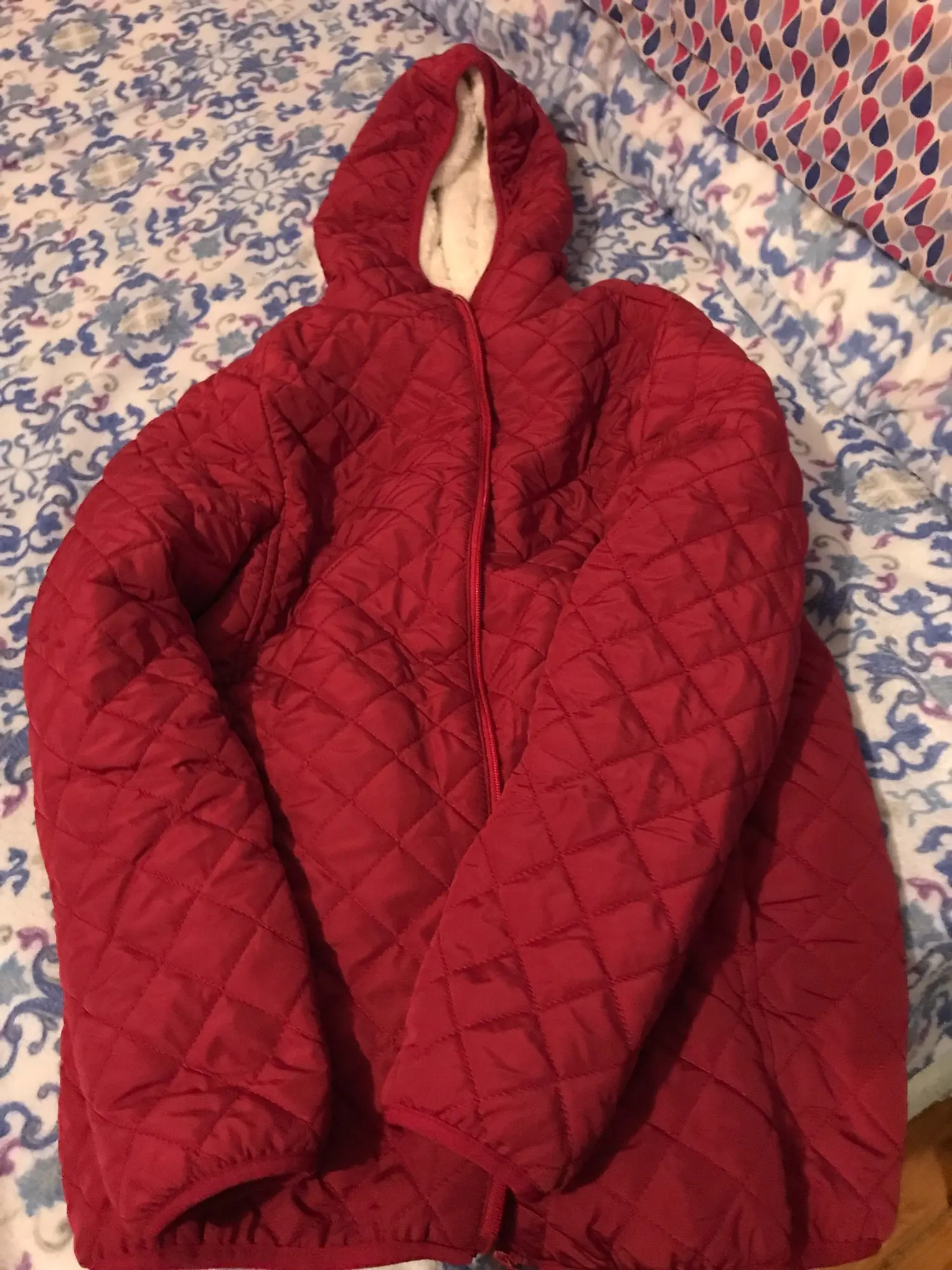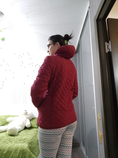 Хорошая куртка за такую цену, очень уютная и мягкая внутри. Сшита аккуратно, запаха не было. Брала для мамы размер М. На мне сидит свободно, на ней плотнее в бёдрах. Рукава достаточно узкие, плотный свитер наверное не влезет под куртку. Капюшон как многие писали не глубокий и будет слетать