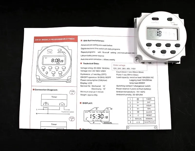 Светильник индикатор, сбрасывается в течение недели и времени, цифровой ЖК-дисплей, монтаж на DIN-рейку. Программный таймер может автоматически включать и выключать различные виды электрооборудования в установленное время. Широко используется для контроля лампы, водонагревателя, распылителя, бутылки, подогревателя, сельскохозяйственных объектов, вещательного оборудования, бытовой техники и т. д.