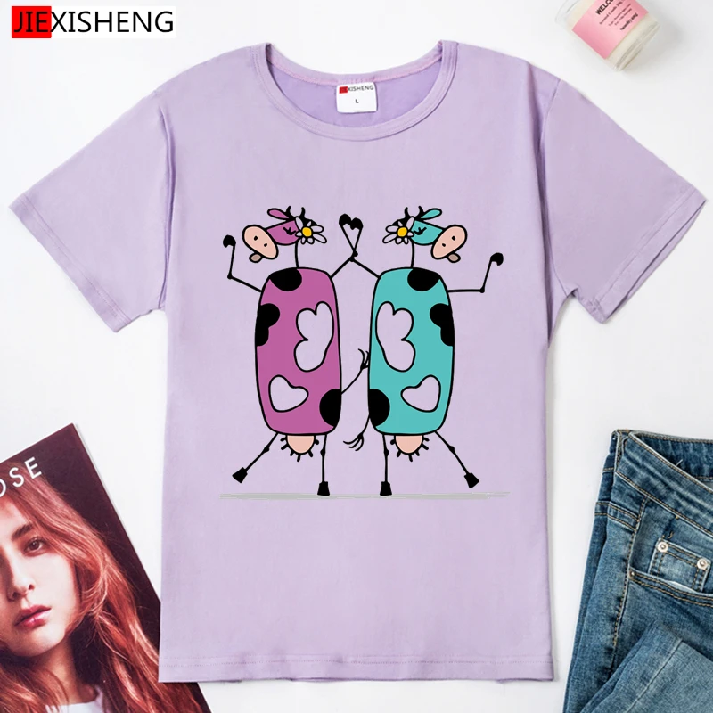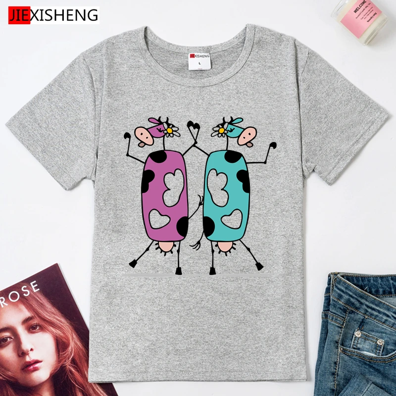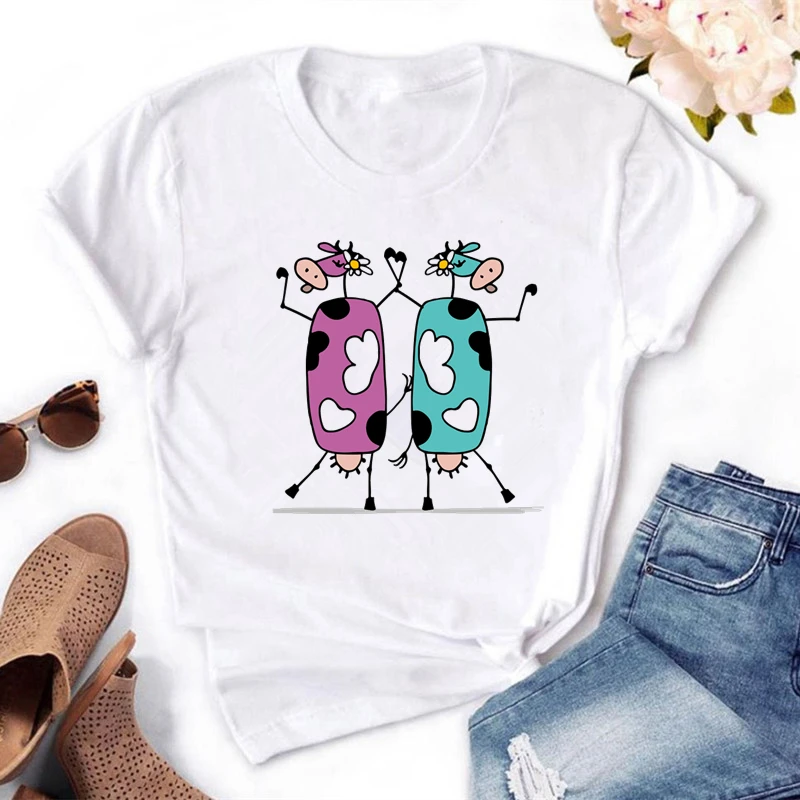 Летняя женская футболка с коротким рукавом, повседневная женская футболка с принтом милого мультяшного корова, свободные белые топы, футболка HH310