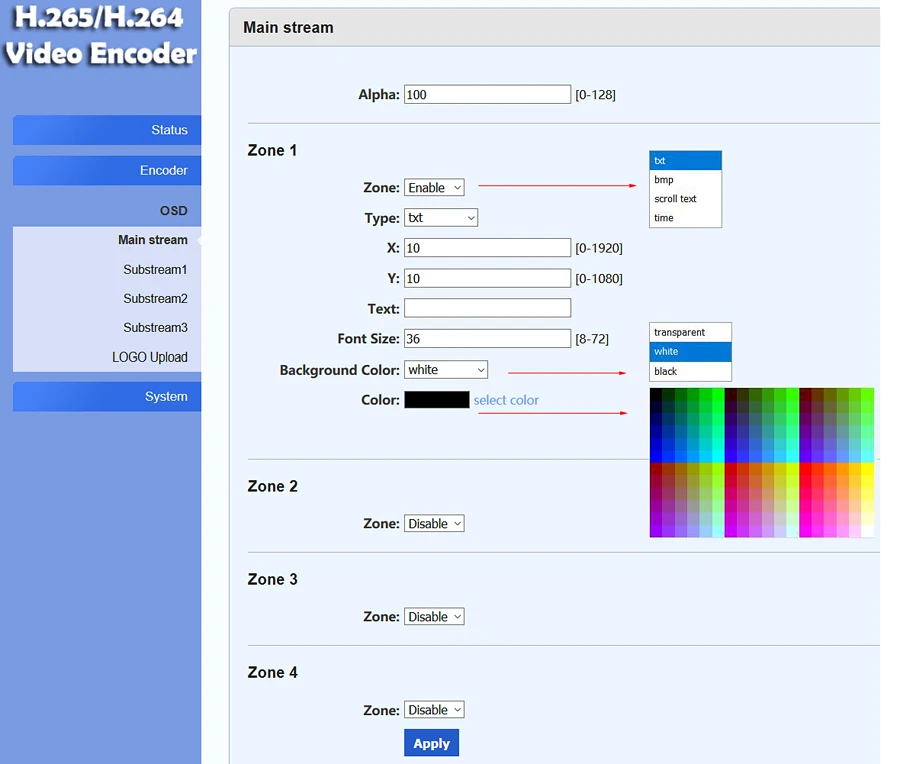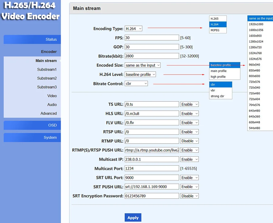 • Встроенная система HiLinux, стабильная и эффективная• Поддержка широкого удаленного управления сетью (через переадресацию портов)• Поддержка кодирования видео HEVC /H.265 и MPEG-4 /H.264 AVC и MJPEG для выбора• Поддержка AAC, AAC +, AAC + +,MP3, MP2, AC3, Opus, G.711 кодирование аудио для выбора• Битрейт выходного видеопотока регулируется от 32 кбит/с до 32 Мбит/с (CBR или VBR режим контроля битрейта)• Поддержка SRT, HTTP, UDP, RTP, RTSP, RTMP, RTMPS, HLS(M3U8), FLV, ONVIF, Unitcast, Multicast и т. д. протокол потоковой передачи• Поддержка вставки изображения, логотипа, текста, текста в рулоне, времени на выходе видеопотока• Поддержка обработки видео на выходе (поворот, флип, зеркало, вырезка и т. Д.)• Поддержка вывода отображаемого разрешения видео и настройки частоты кадров (макс. 1920x1080P @ 60fps)• Поддержка передачи различных протоколов для 4 выходных видеопотоков• Supportchoose HDMI Встроенный аудио или внешний аудио (3,5 мм jack) выход аудио• Поддержка обновления устройства путем обновления новой прошивки• Поддержка настройки кодировщика через веб-страницу или приложение• Предоставление SDK и API и CGI для вторичного развития• Полнодуплексный режим сетевого интерфейса с скоростью 1000 м• Поддержка HDCP и HD blue-ray• Веб-страница на английском языке, пользовательский язык• Нажмите, чтобы восстановить Конфигурацию по умолчанию• Стабильный и эффективный, поддержка 7x24h рабочего времени• Поддержка многоканальной стойки 1U или стойки 3U, до 16 кодовых карт можно установить в стойку 3U• Предоставляет множество видов кастомизации (печать логотипа, languagecustomization, прошивка или настройка функций и т. Д.)• Многоплатформенная прямая трансляцияЭтот кодировщик HDMI легко управляется. Превратите камеру/устройство, оснащенное HDMI, в источник видео и прямую трансляцию на любой потоковой платформе. Он совместим с большинством платформ прямого вещания, таких как Ustream, Livestream, Facebook live и YouTube Live или даже создает свой собственный сервер потокового мультимедиа, например, Wowza или Xtream. Он поддерживает многопотоковый выход, до 4 видеопотоков одновременно. Вы можете одновременно подключить мультивидеопоток к многоплатформенной.