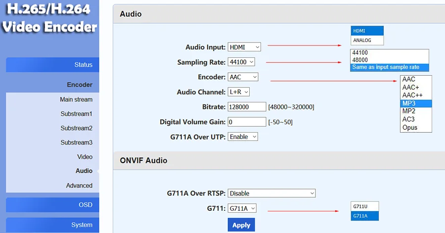 AAC, AAC +, AAC + +, MP3, MP2, AC3, Opus, G.711