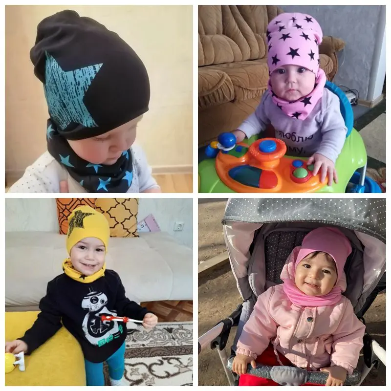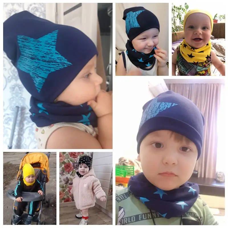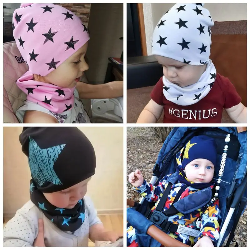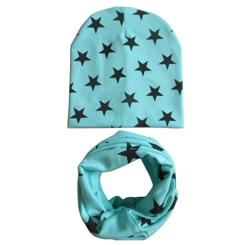 Шапка и шарф Детские, хлопковые, для мальчиков и девочек, с принтом в виде звезд, на зиму и весну, шапочка для новорожденного