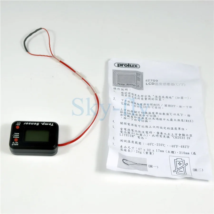 Датчик температуры LCD Prolux PX2709-40 ~ 250 градусов ЦельсияПараметры:1. Обнаруживает, как правило, температуру двигателя, очень удобно использовать2. Может запоминать последнюю настройку температуры (°C или °F) При перезапуске питания.3. Диапазон температур: -40 градусов Цельсия ~ 250 градусов Цельсия (-40 °F ~ 482 °F)4. Измерение: 47*32*17 мм (предмет), 210 мм (Температурный конец)5. Вес: 24 г