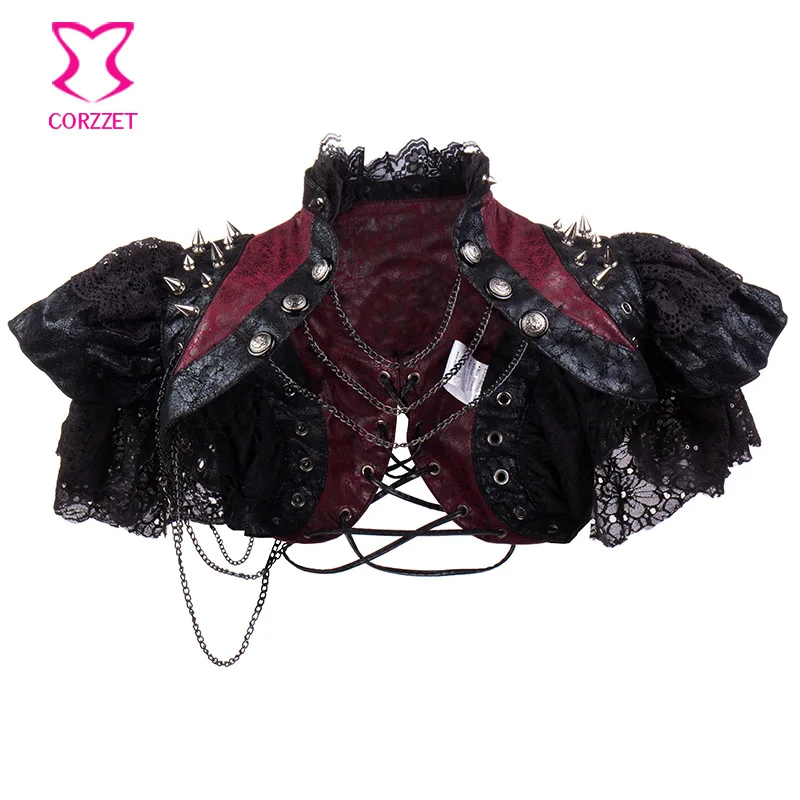 Женская куртка с коротким рукавом-бабочкой, красно-черная винтажная куртка из искусственной кожи с кружевными заклепками и цепочкой в стиле панк-рок и готика, пальто в стиле стимпанк
