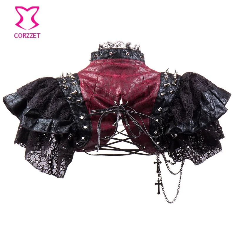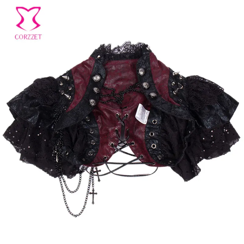 Куртка женская короткая с заклепками и кружевом, винтажный пиджак в стиле стимпанк, на пуговицах-цепочках, с рукавом-бабочкой, красная кожа и черный цвет, в готическом стиле