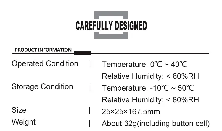 Батарея: 1,5 V кнопочный элемент, LR44 или эквивалент, 3 предмета в комплекте