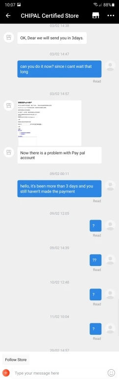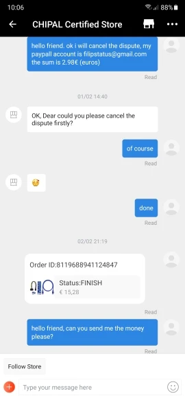 Очень плохой и обманчивый продавец. Они не отправляют товары или не отправляют поврежденные. Если они предлагают вам возврат через paypal в обмен, чтобы отменить спор-не акцентируйте, потому что они никогда не будут отправлять вам деньги.