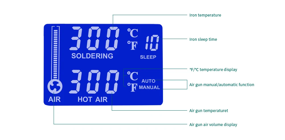Автоматический режим: Возьмите Пистолет с горячим воздухом и Поднимите температуру в рабочее состояние. Опуская Воздушный пистолет, температура остывает, и пистолет войдет в спящий режим ожидания;