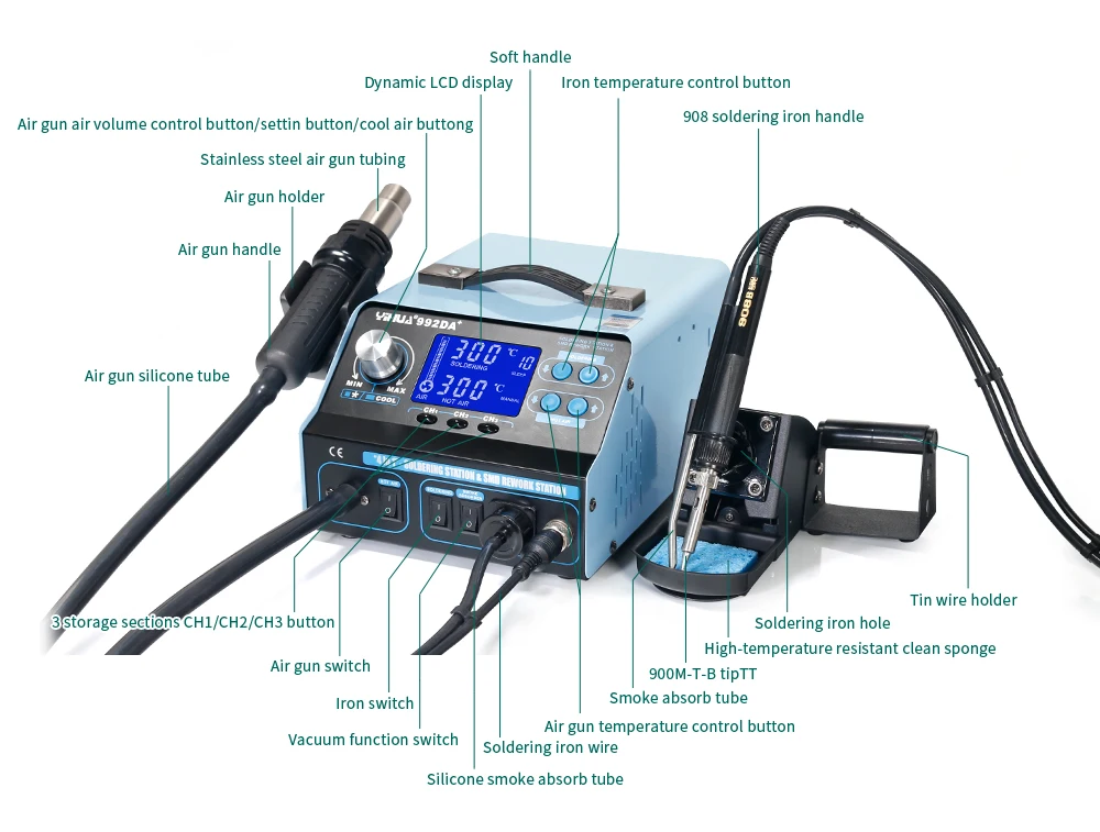 Паяльник всасывается через дым, поглощение пыли, фильтрацию. Эта функция обеспечивает эффект очистки воздуха и обеспечивает здоровье, защиту окружающей среды.