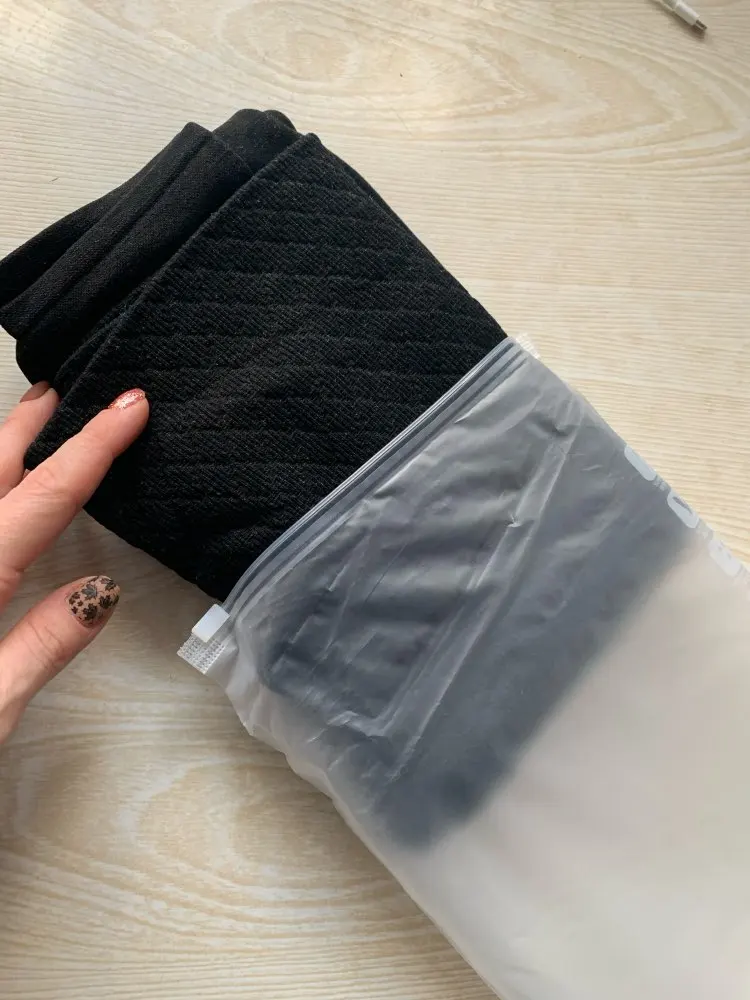Тёплые, плотные, приятные к коже. Швы ровные, нитки не торчат. Не понравились боковые швы. Если они предназначены для поддержки, то у них это не очень получается. А так - отличные леггинсы под брюки, тунику или юбку. Упаковано в зип-пакет и обычный почтовый
