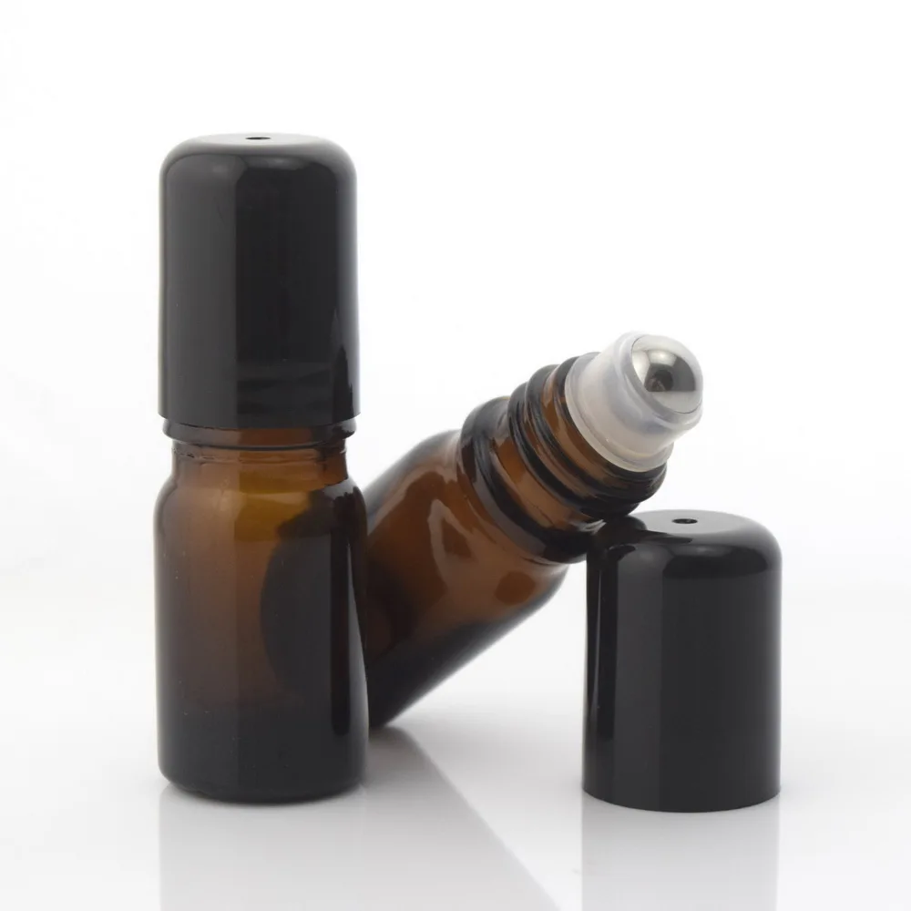 12 шт. 5 мл рулон янтарного стекла бутылки Флаконы с шариком из нержавеющей стали, черная крышка для Парфюмерные эфирные масла Ароматерапия