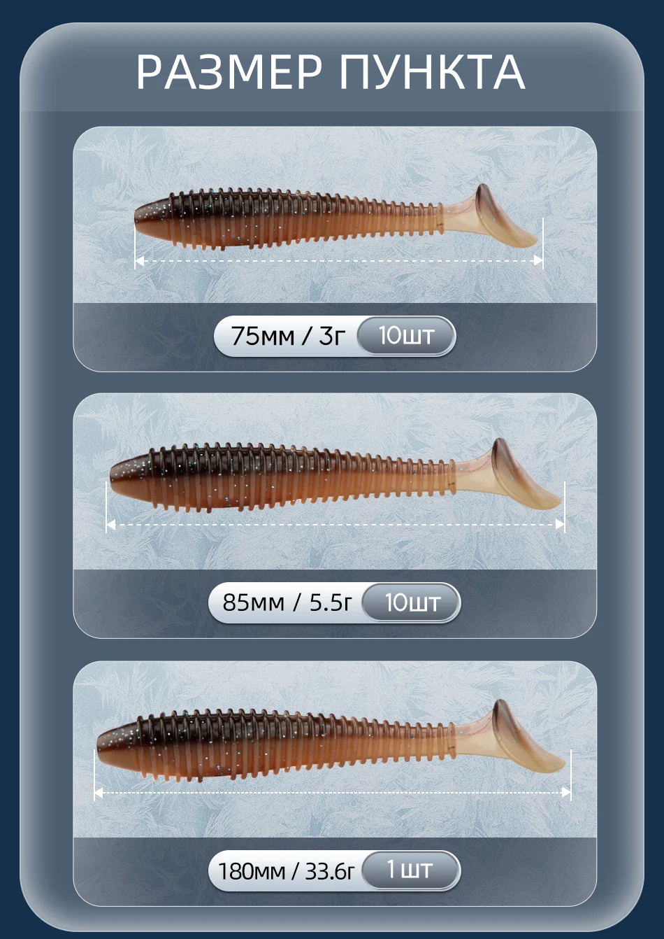заказываю приманке тут не первый раз. К продацу претензий нет, приманки рабочие. Одно но - темные цвета - почти все прилично темные. и отличить навскидку сини от коричневого бывает сложно ) в остальном - резина живучая, практичная.