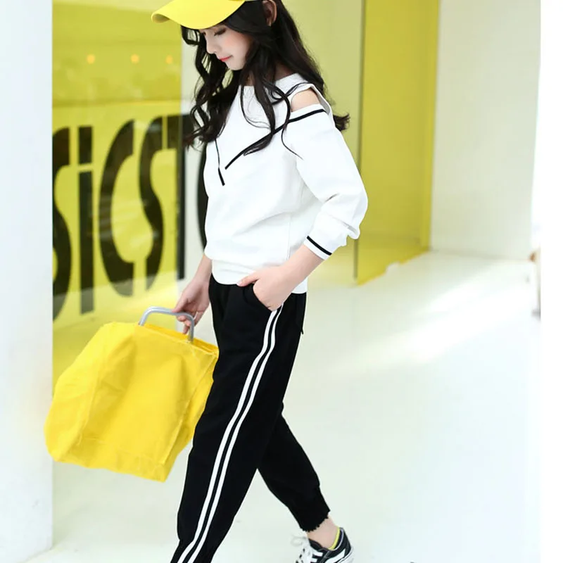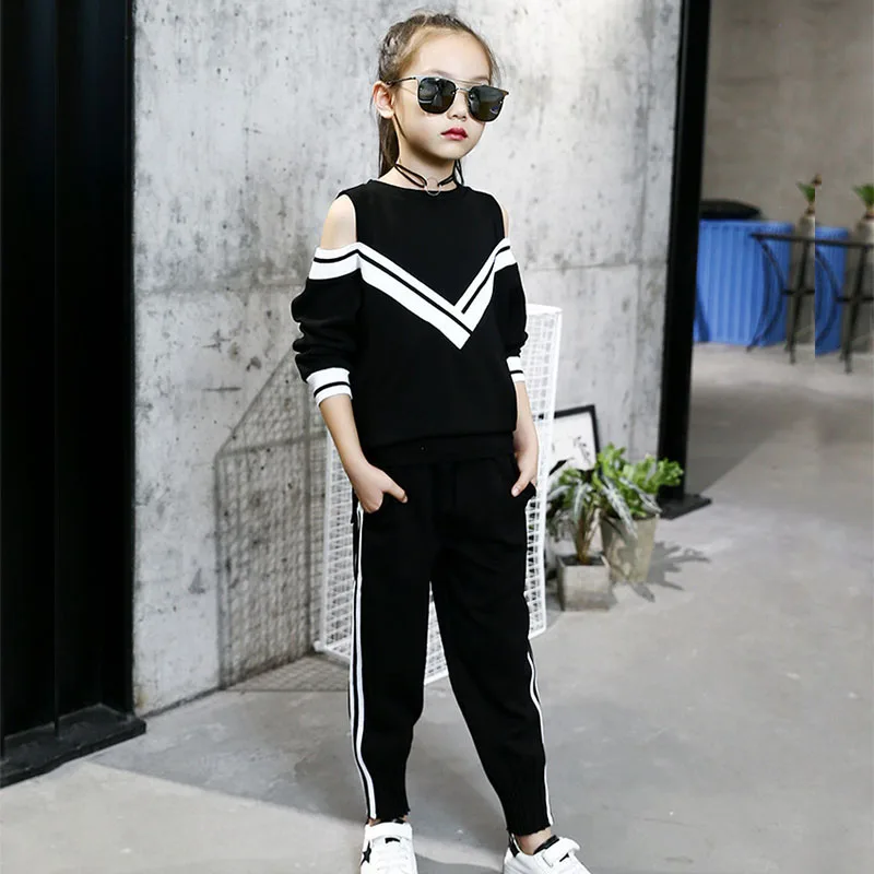Спортивный костюм для девочек, на возраст 10-12 лет, черно-белая футболка с длинным рукавом и открытыми плечами, 2022
