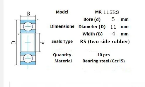 Миниатюрный подшипник MR115RS 5*11*4 (мм), ABEC-5 из хромированной стали, 10 шт.