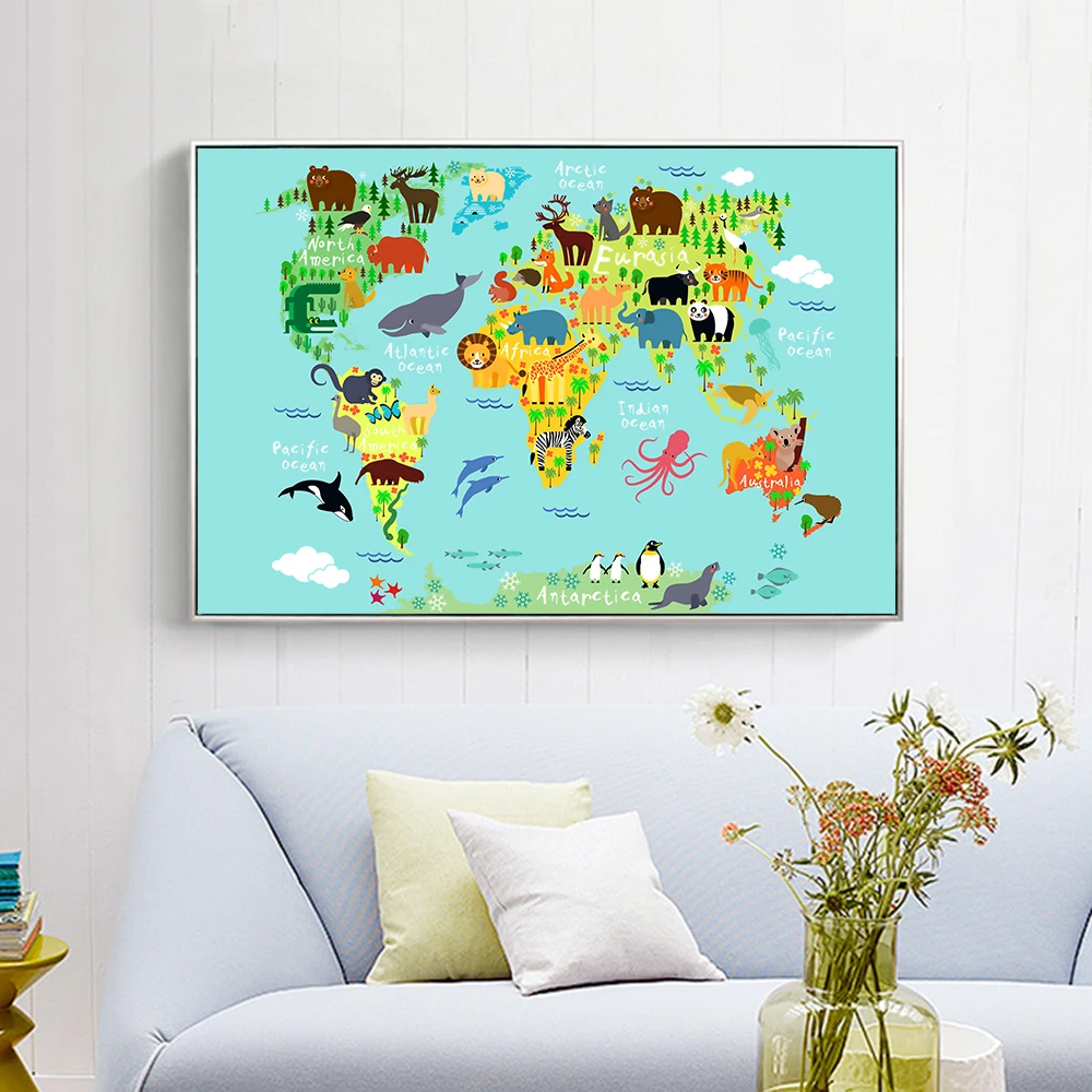 Картина на холсте без рамки с изображением мультяшных животных, карты мира