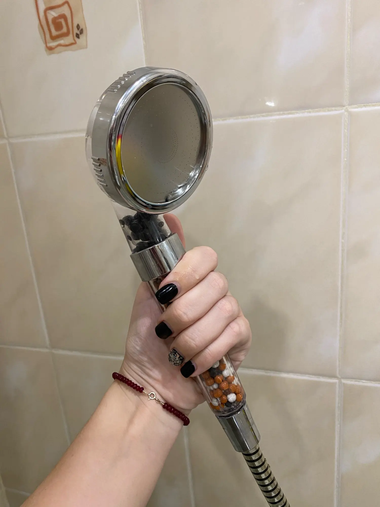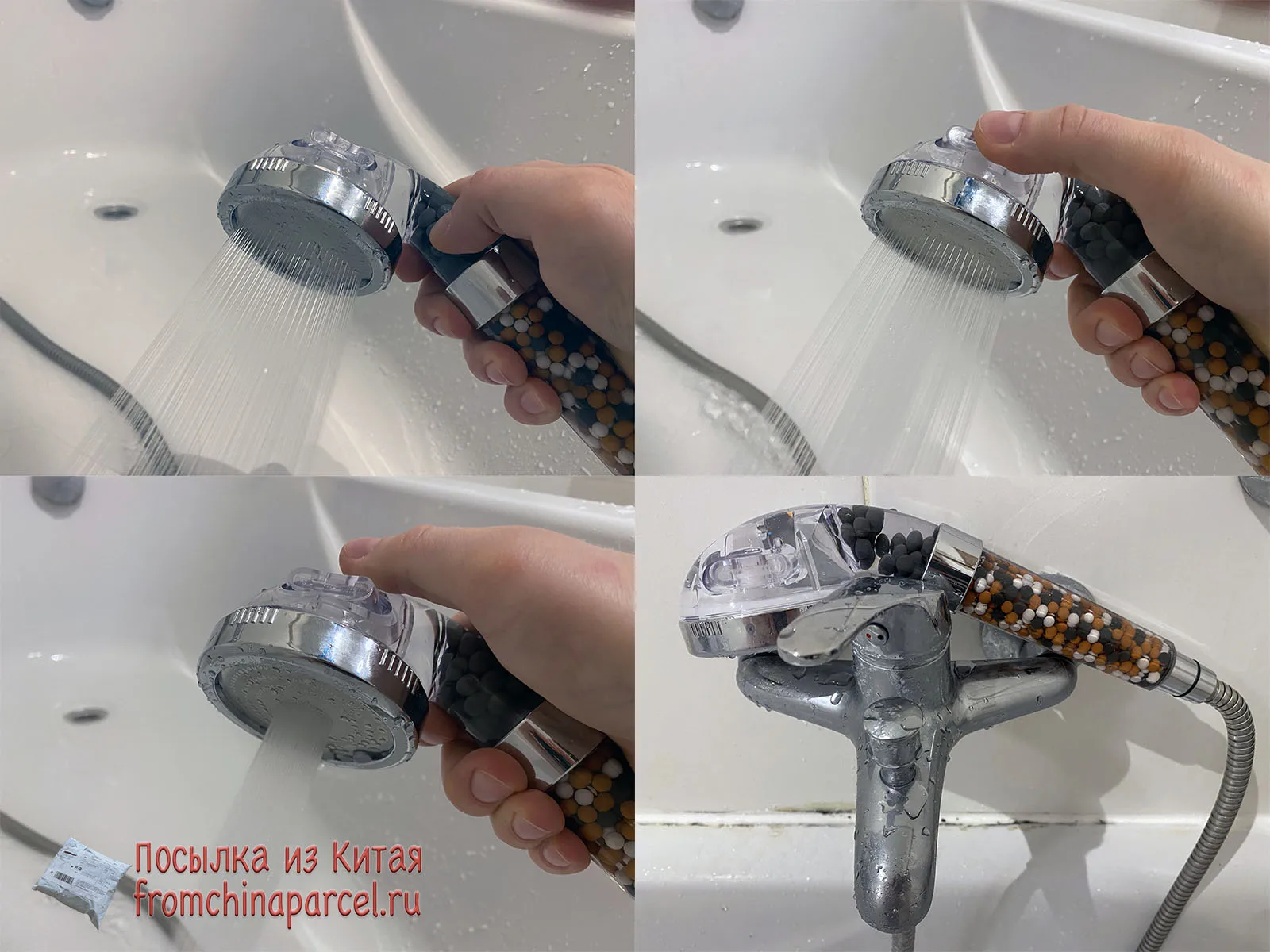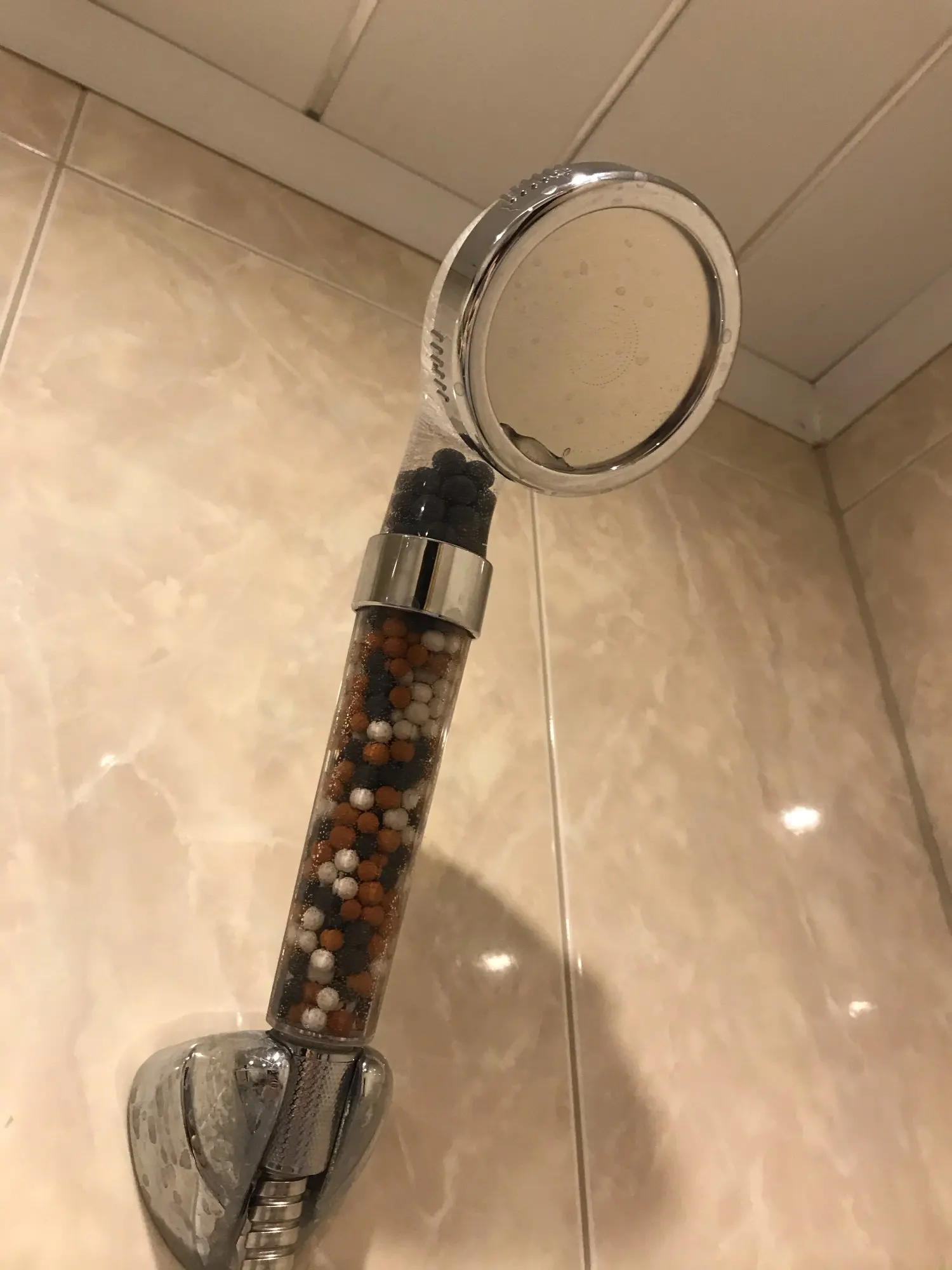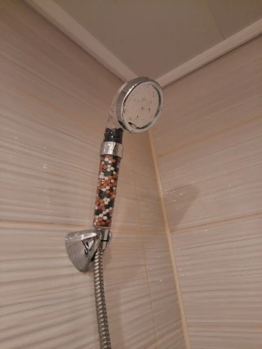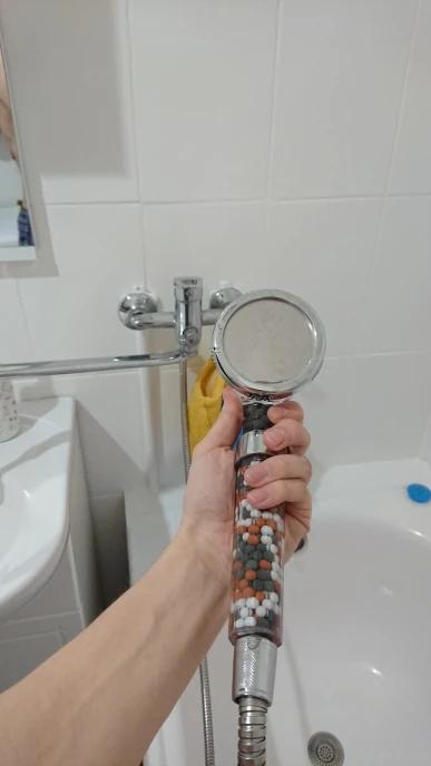 Я только что получил насадку для душа и она идеальна. Пластик кажется немного хрупким, я думаю, что он может легко тормозить. Я купил это из-за плохой воды здесь, в Германии. Я также купил один душевой фильтр (вы можете увидеть его на фото), поэтому я надеюсь, что с этим комбо вода улучшится :) очень хороший продавец, я настоятельно рекомендую!