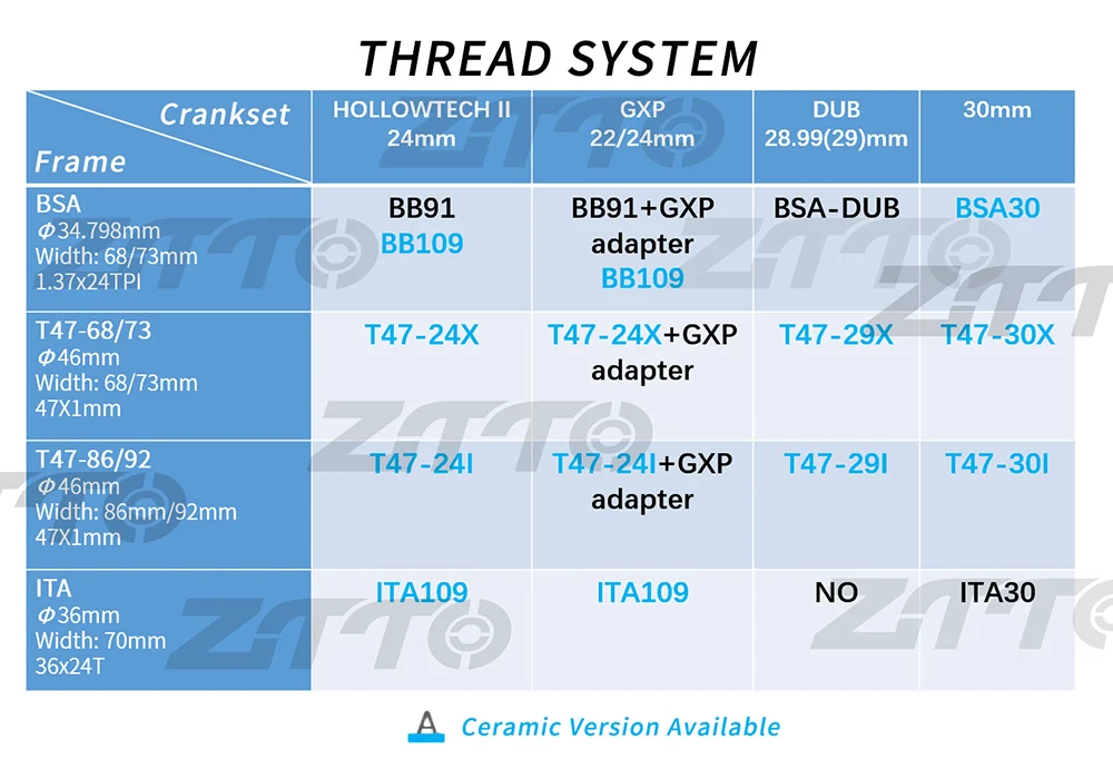 Каждый кронштейн ZTTO изготовлен для лучшей производительности и долговечности. Сочетая высококачественные компоненты и ноу-хау, мы гарантируем, что каждый Нижний кронштейн дает возможность каждому гонщику экономить энергию или кататься быстрее.