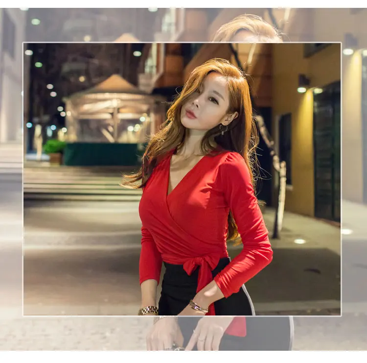 Женская обтягивающая футболка Gkfntm, с глубоким V-образным вырезом, на шнуровке, повседневная, красная, черная, на осень, 2018