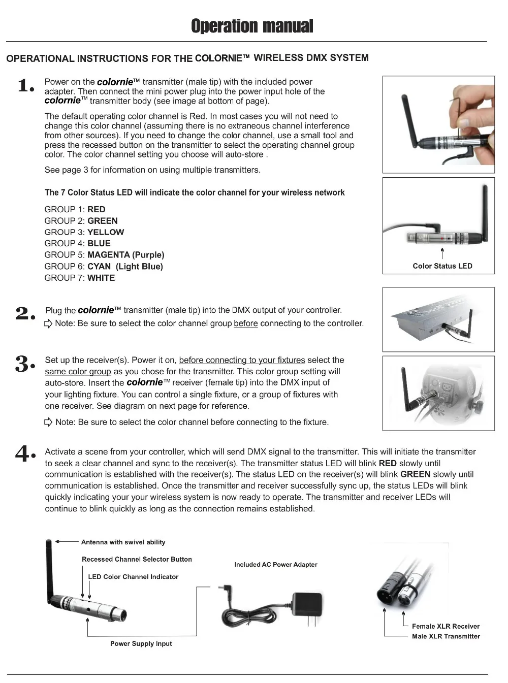 3. Красный светодиодный индикатор мигает, когда передатчик передает данные DMX без помех, а затем приемник изменяет частоту передачи. Зеленый светодиодный фонарик до получения исправленного идентификационного значения, светодиодный фонарик более быстрый, как только Данные DMX будут более быстрыми.