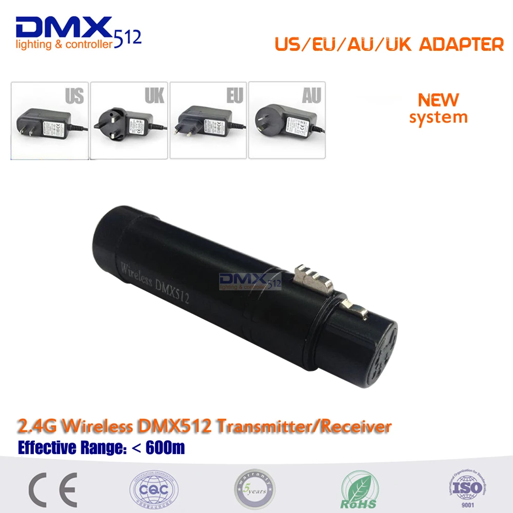 Беспроводной приемник/передатчик DMX512 передает стандартные данные протокола DMX512 (генерируемые консолью) беспроводным способом, которые решают проблемы управления освещением беспроводной передачи полностью между контроллером освещения и освещением, освещение и освещение и так далее. Он избавляется от необходимости полностью полагаться на соединительные кабели.