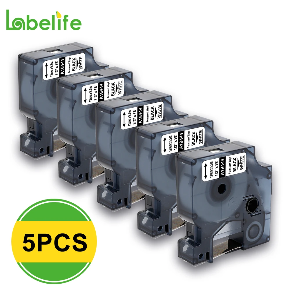 5 упаковок 18444, черныебелые виниловые этикетки для DYMO Rhino IND, Рино 12 мм лента для маркировки, промышленный картридж, винил для принтера этикеток