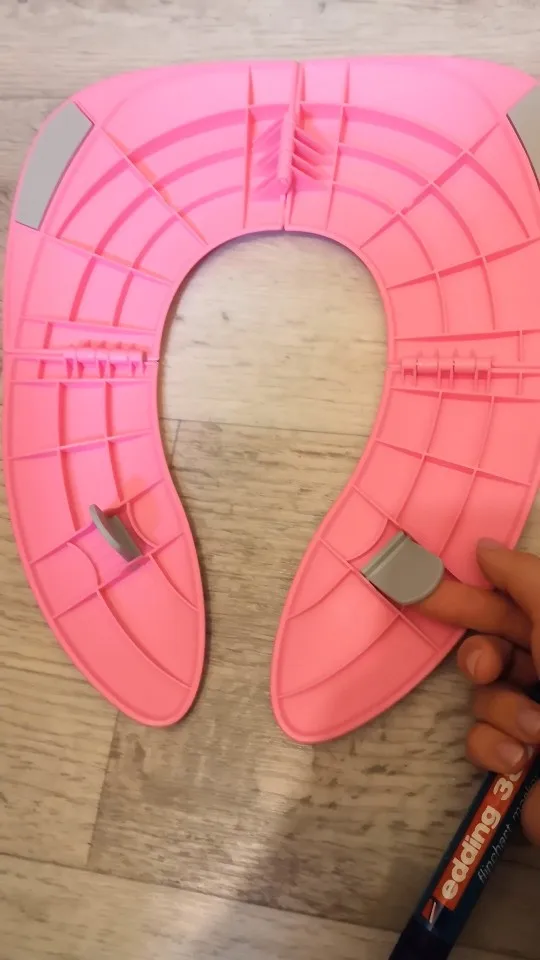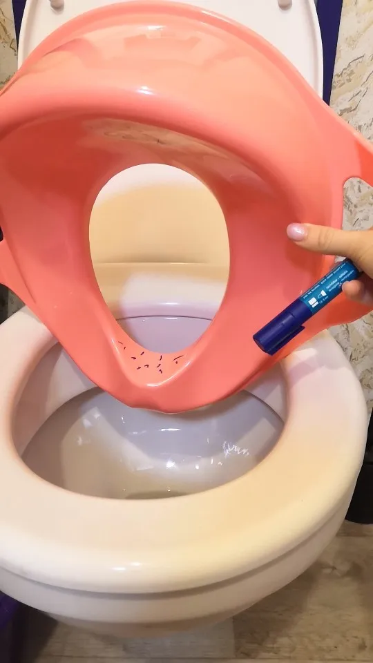 Удобно брать с собой. Очень компактное. Есть на обратной стороне складные ограничители, чтобы не съезжало вперед. По сравнению с другими сиденьями для унитаза, для меня лично, удобно было то, что по конструкции сиденье не в виде кольца и + достаточно тонкое. Но в то же время прочное. Обычно при мочеиспускании у девочек попадают брызги на переднюю стенку кольцевого сиденья. А тут как раз все остаётся чистое. *Показала на фото пример с применением маркера для белой доски.