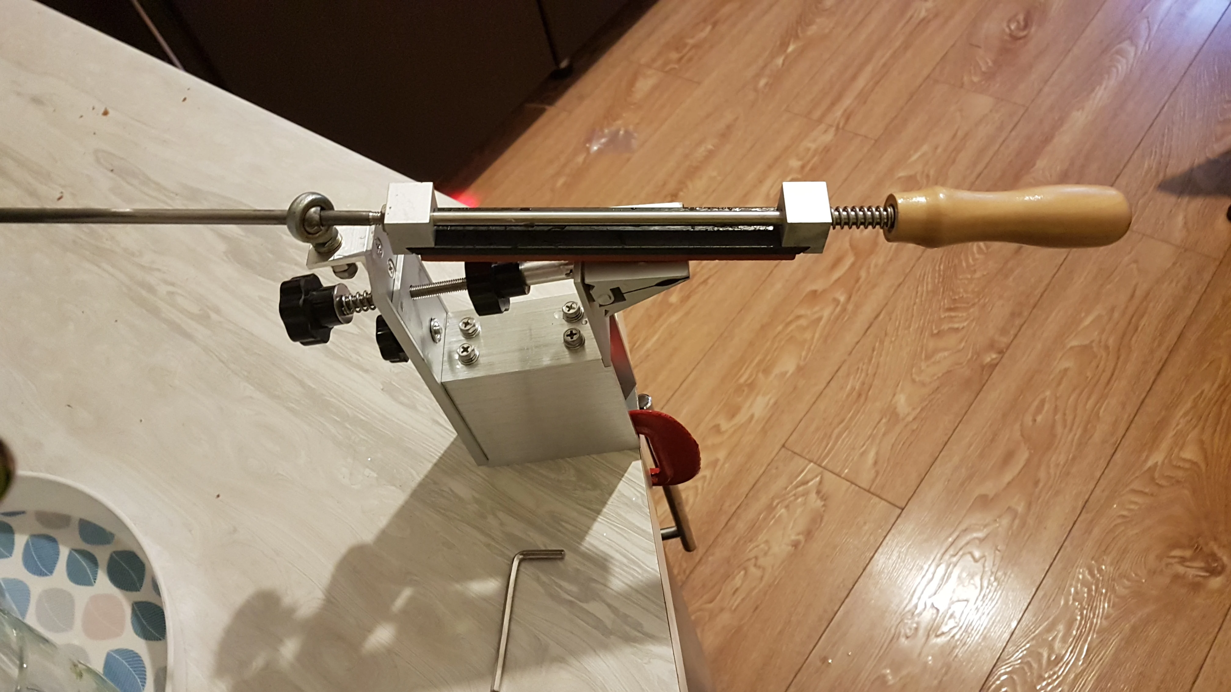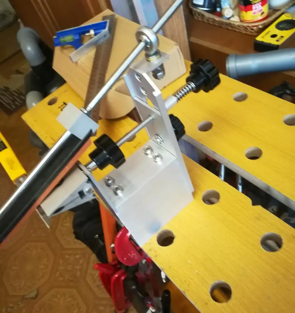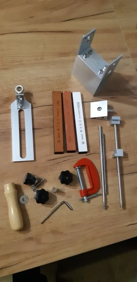 Отправлена - быстро, дошла - быстро, описанию соответствует полностью, все детали фрезерованы аккуратно. Продавец "пупырки" пожалел, один брусок не доехал живым. Сами бруски идеально ровные, хорошего качества, но "на сухую" засаливаются с одного ножа. Сама же точилка - фуфло. Если, только, брать этот набор как конструктор, и самому переделывать. Всю длину бруска, можно использовать, только на широких клинках. Узкие, овощные ножи, точить проблематично: нормально не зажать, малый угол не выставить, брусок, постоянно тыкается в заднюю стенку точилки. На больших углах - задняя планка играет. Внутреннее отверстие шарового подшипника - не шлифовано. Поэтому шток в нем двигается рывками (даже со смазкой). Берем пасту ГОИ, шуруповерт и ... притираем. Вся конструкция построена на 8ми сантиметровом обрезке трубы 80х40... Втулку 10х8, лучше поставить сзади (на фото), тогда и лапка не люфтит, и переворачивать ее можно, подажимая задний барашек. Стяжной винт лапки - сразу обрезать, иначе...