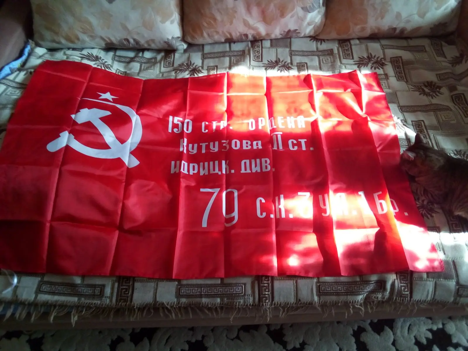 Мега быстрая доставка до Челябинской области. Две недели. Как и хотел чтоб успели к 1 Мая. Хочу повесить на даче. Да и на 9 мая будет актуально. Упаковка не повредилась. Похож на шёлковый. Принт яркий. Короче прогладить утюжком и на древко!!!