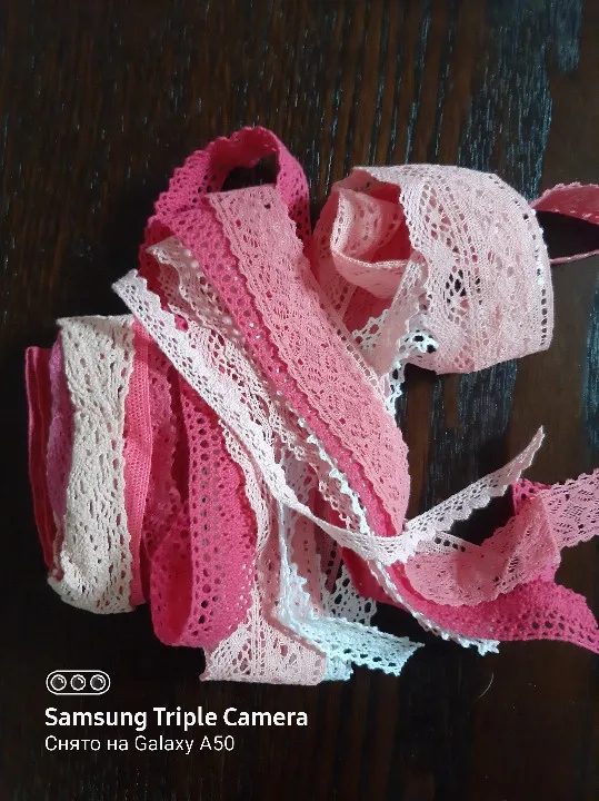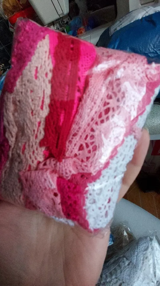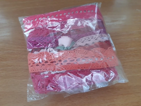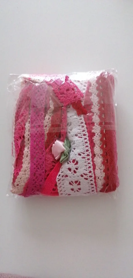 10 метров кружева в бнло-розовой гамме.Дошло хорошо,кто берёт для шитья детям или куклам очень подходит.Но одно кружево было из 2-х кусочков связано,кому надо прошить одним куском 1 метр,такое кружево не подойдёт.Мне всё понравилось.Продавца рекомендую.Подарок-розочка из ленты.