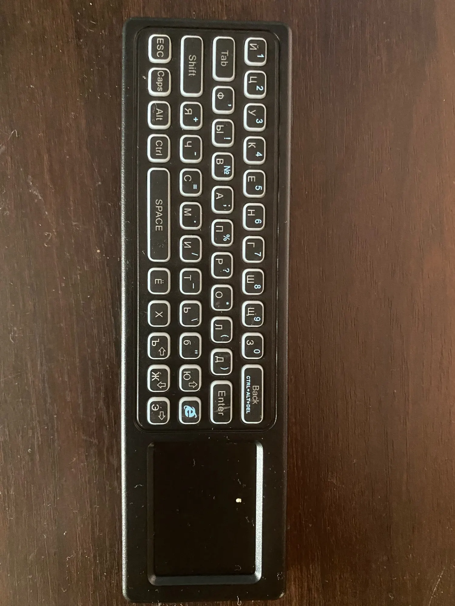 Будьте внимательны на клавиатуре пульта с русскими буквами нет латинницы (eng), только русский и спецсимволы, и т.к. на моем ТВ кривой андроидTV то он в одних программах печатает только на русском (без английского), а в некоторых только английский причем что печатать ты не видишь т.к. на клавиатуре нет английской раскладки. Короче пульт может работать у вас полноценно а может как у меня валятся бесполезным т.к. проще набрать в поиске штатным пультом перемещая курсор по экранной клавиатуре. А еще при переключении на спецсимволы клавиша backspace превращается в alt+ctrl+del что в свою очередь при ее случайном нажатии тупо отправляет телек в перезагрузку - капец как бесит! Написал продавцу о проблемах он ответил херней из инструкции - типа у тебя кривой телек и попробуй еще чего нибудь! Аэромышь работает нормально.