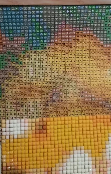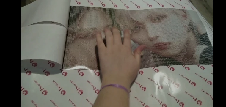 Пришли целые, немятые, хотя без коробки, намотаны на валик. Цвета страз есть все. На размер 30×40 стандартно по 35 цветов. Такое впечатление, что это лимит по цветам для такого размера. Отмечу, что в этот раз значки прорисованы чётко. На светлых оттенках чёрным. Одну картину закончила. Пришлось на правой руке менять цвет, сливалась с фоном, хотя на фото граница чёткая. После корректировки понравилась. Осталось много лишних страз. Продавец присылал макеты перед отправкой.