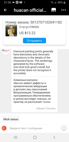 Хочу поделиться мнением о своей покупке. Заказала вышивку размером 55*70. Продавец быстро вышел на связь, помог решить проблему с качеством фото. В Украину, город Киев, посылку отправили 18.11, я ёё получила 02.12 (15дней). Упаковка наверное при транспортировке немного примята, но сама вышивка плотно запечатана и внутри валик, чтобы поддерживать форму. На размер 55*70, было положено 48 цветов. Я очень рада, что заказала у этого продавца и буду его всем рекомендовать! Продавец вежливый, отвечает на все вопросы. Рекомендую!