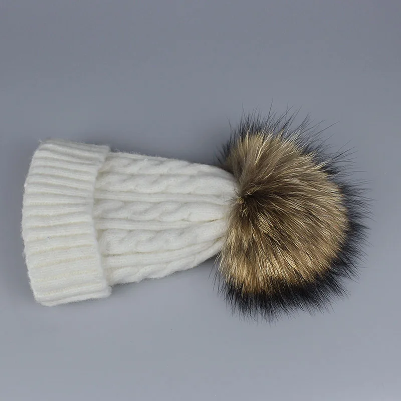 Женская шапка с помпоном из меха енота, зимние теплые шерстяные шап...