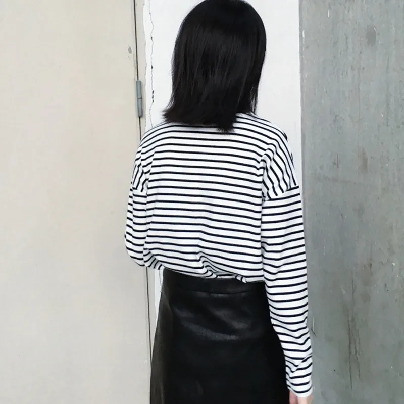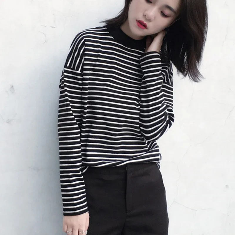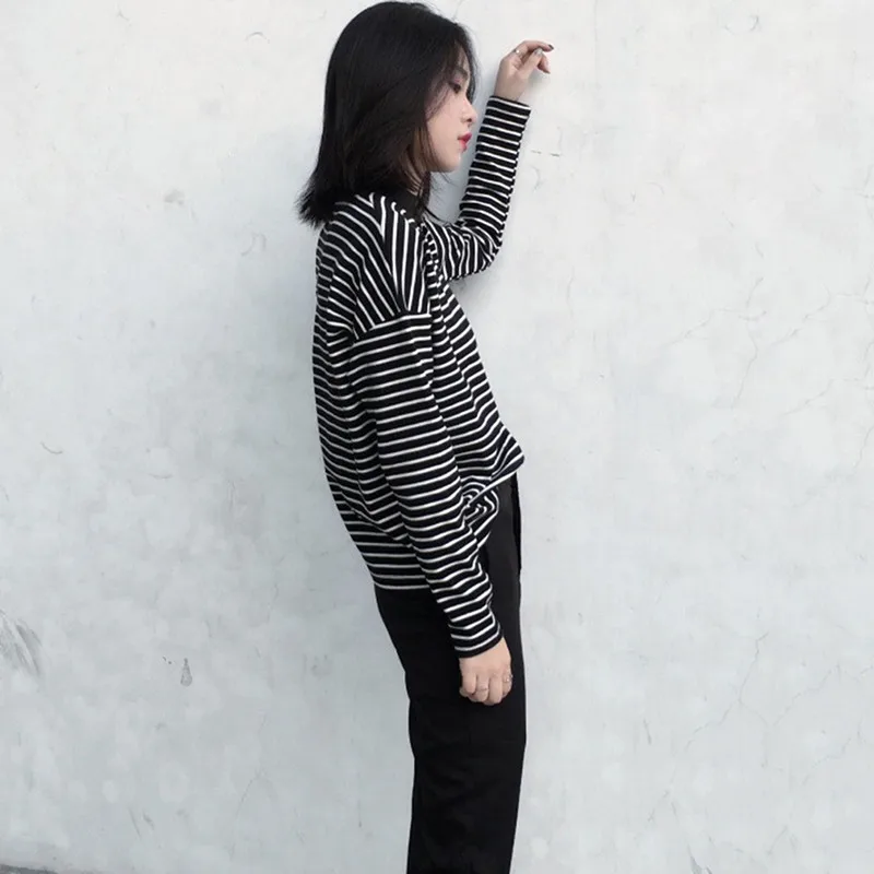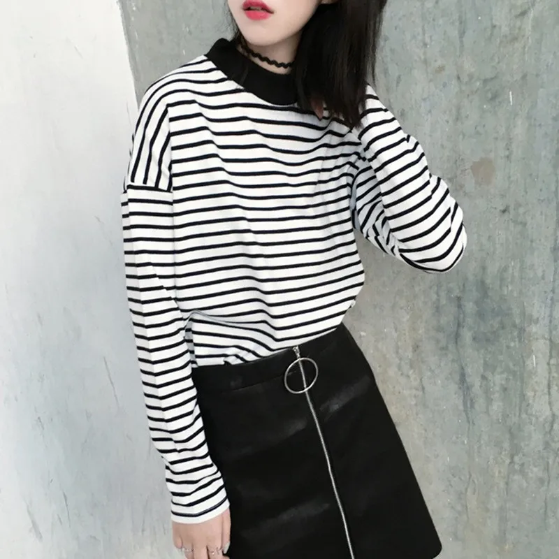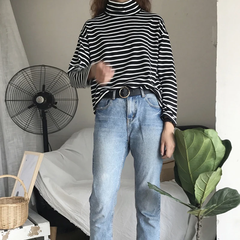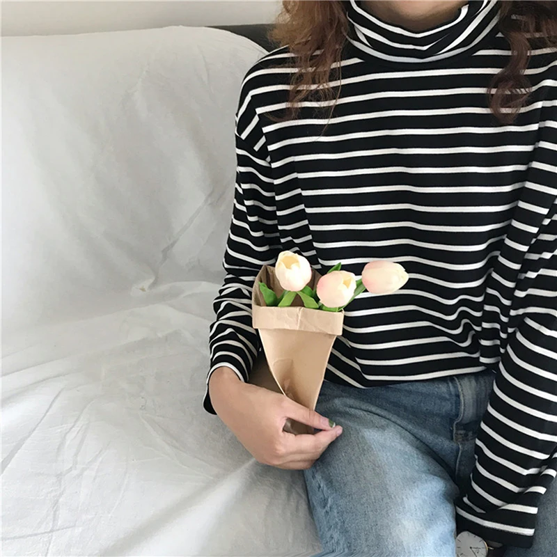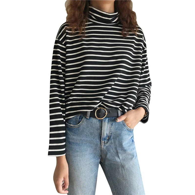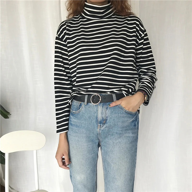 Женская футболка, новинка весны 2021, Корейская полосатая водолазка в стиле Харадзюку, женские футболки с длинным рукавом, повседневные топы