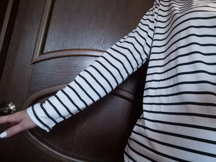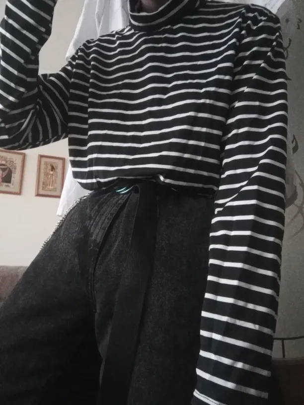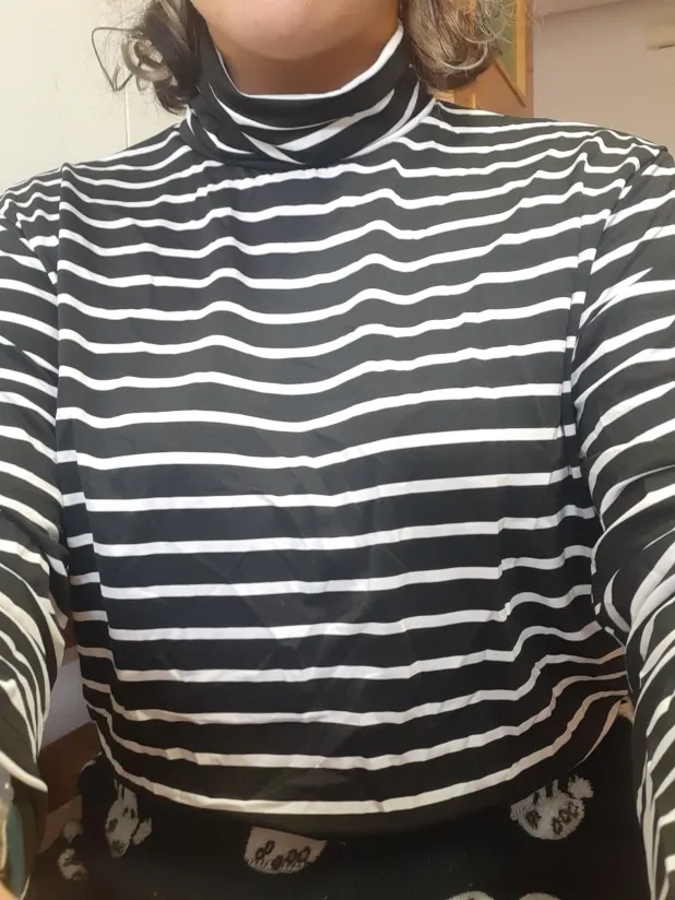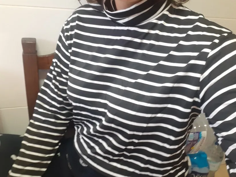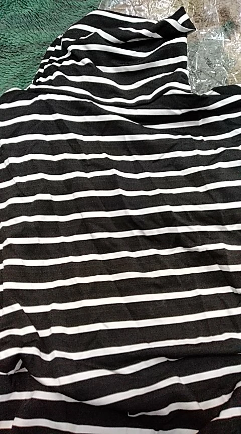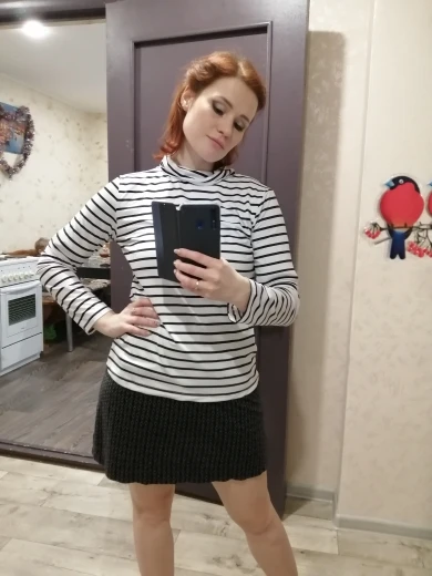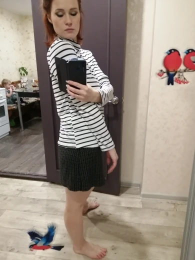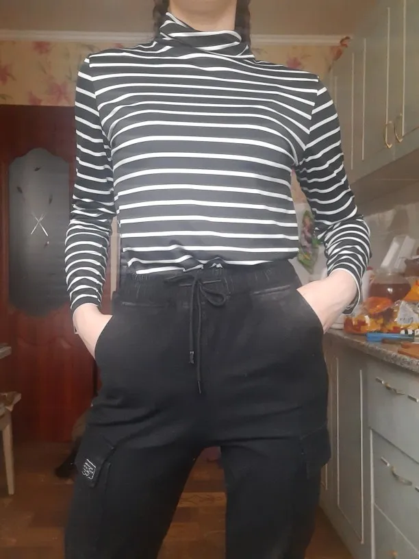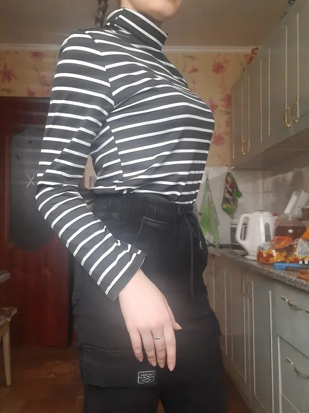 Водолазка тонкая, ткань похожа на искусственный шёлк. Она не стрейчевая, поэтому лучше брать размер больше, чтоб сидела свободно. У меня размер 44, рост 164, взяла XL, хорошо в ширину и рукав не короткий. Полоски на стыках не совпадают, но я на это и не надеялась )) А так сшита аккуратно