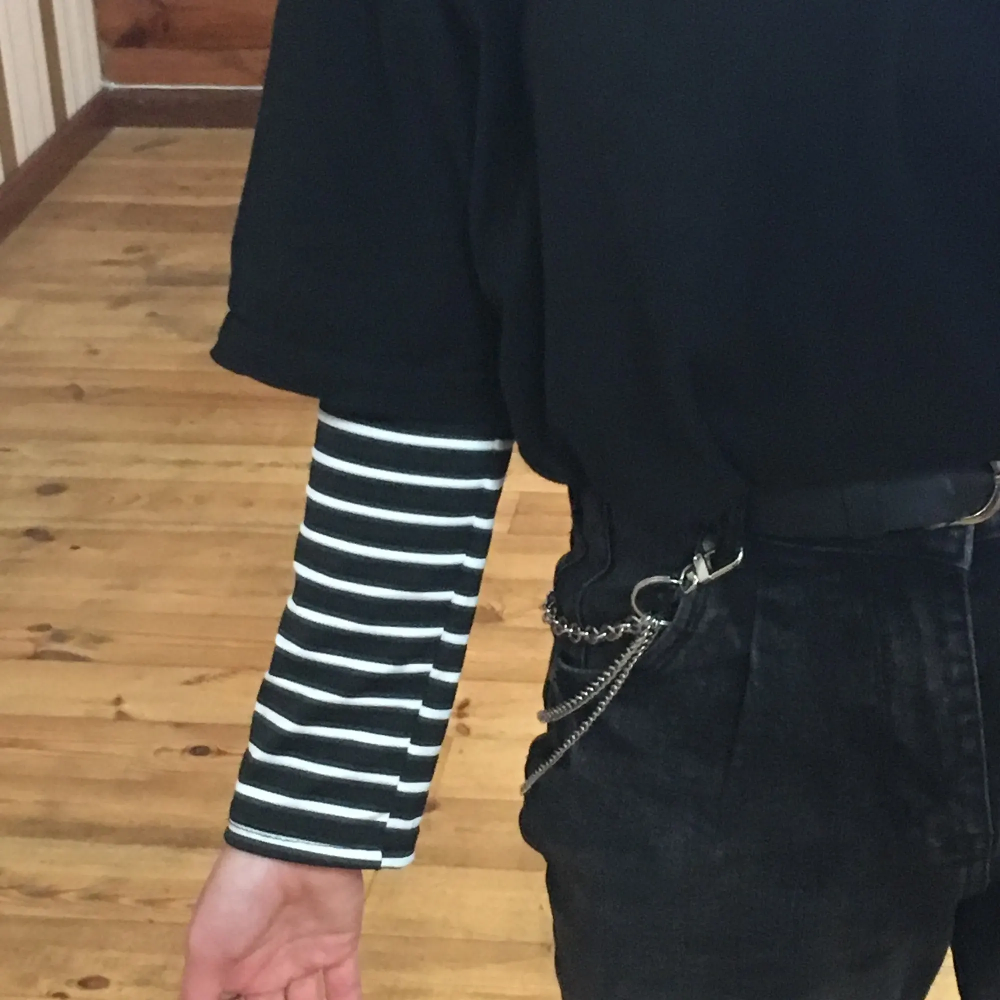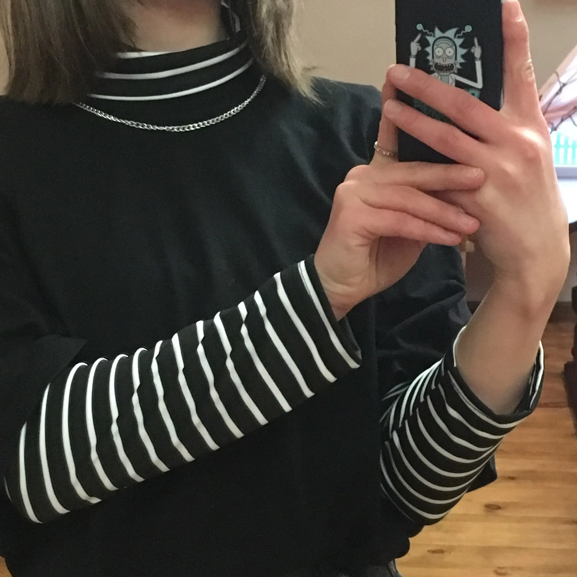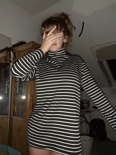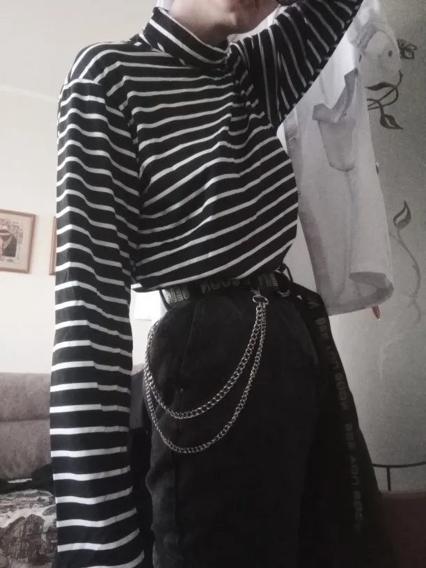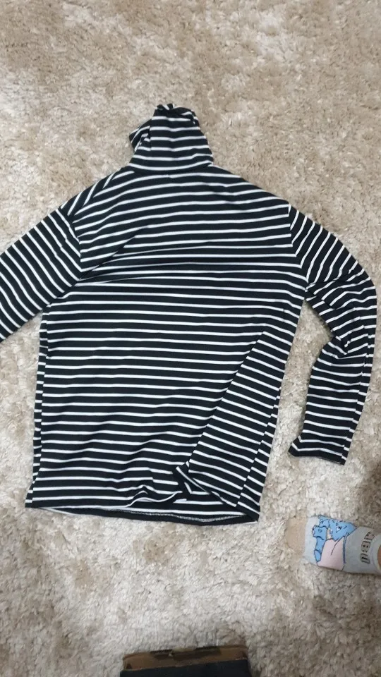 Водолазка тонкая, ткань похожа на искусственный шёлк. Она не стрейчевая, поэтому лучше брать размер больше, чтоб сидела свободно. У меня размер 44, рост 164, взяла XL, хорошо в ширину и рукав не короткий. Полоски на стыках не совпадают, но я на это и не надеялась )) А так сшита аккуратно