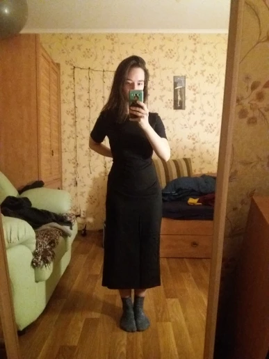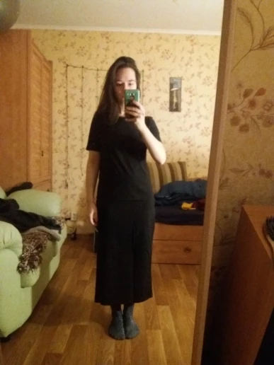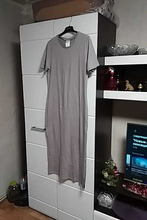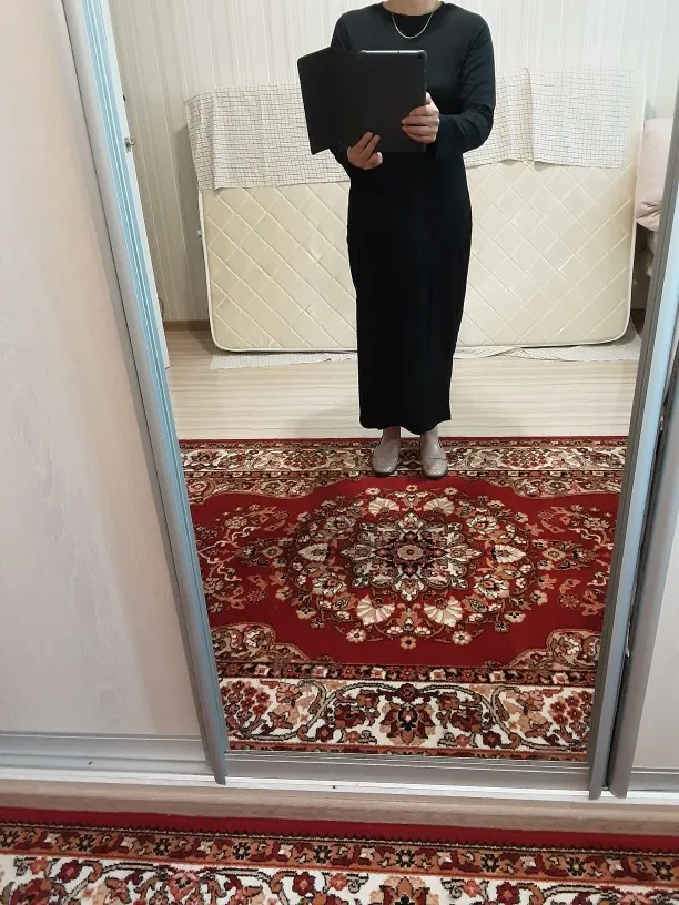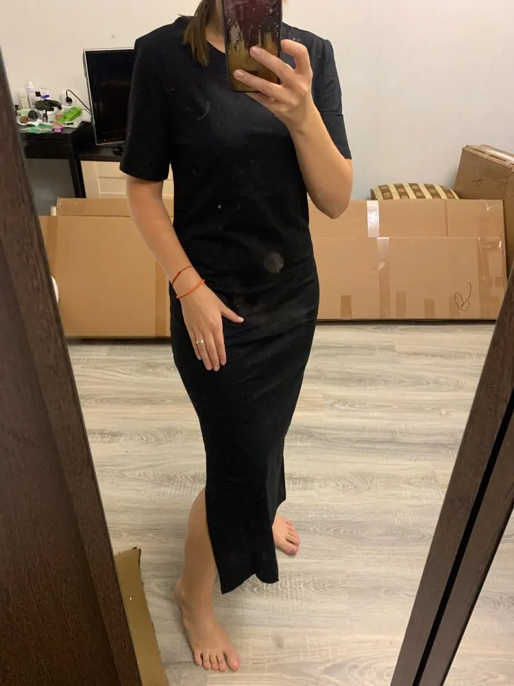 Очень хорошее платье, взяла как домашнюю одежду. К телу приятно, на талию 71 сантиметр и бёдра 99 сантиметров взяла L, сидит свободно. Строчки ровные, ниток совсем чуть-чуть. Подумаю о том, чтобы взять в двух цветах уже на выход. До Московской области чуть больше, чем за две недели.