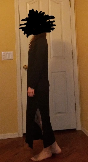 Когда распоковала подумала какая фигня,но потом померила и влюбилась в него. У меня с длинным руковом,рукава не обтягивают. Пошито прекрасно,сидит классно где надо облегает,где ненадо свободно. На параметры 90-74-94 рост 162 см сидит хорошо только длина большая,можно под ремен попробовать- будет покороче или обрезать.Разрез это изюминка платья.