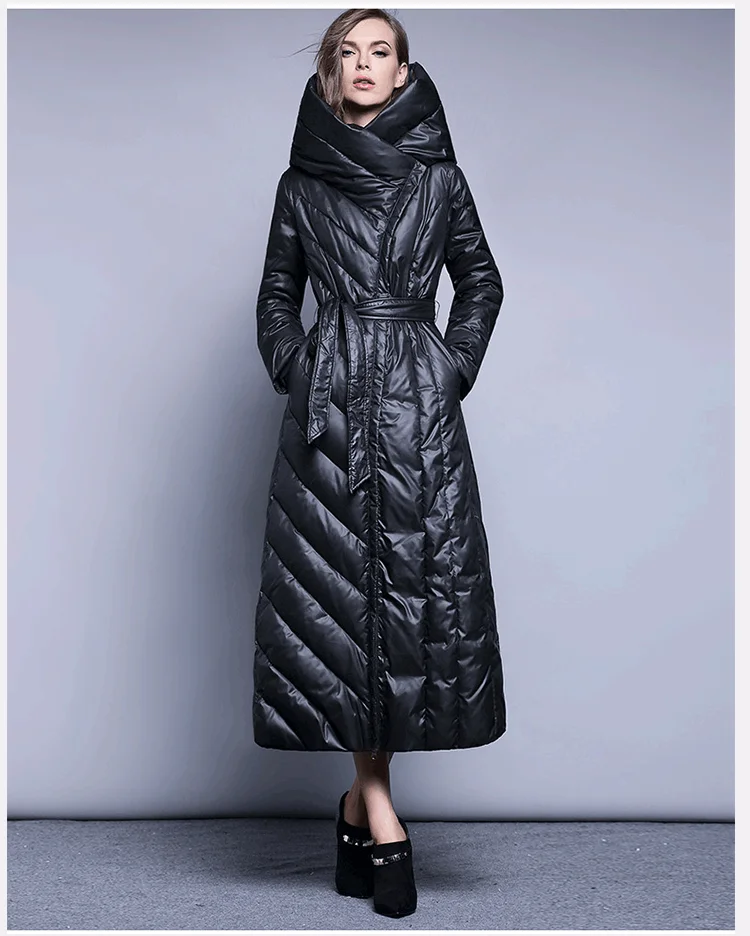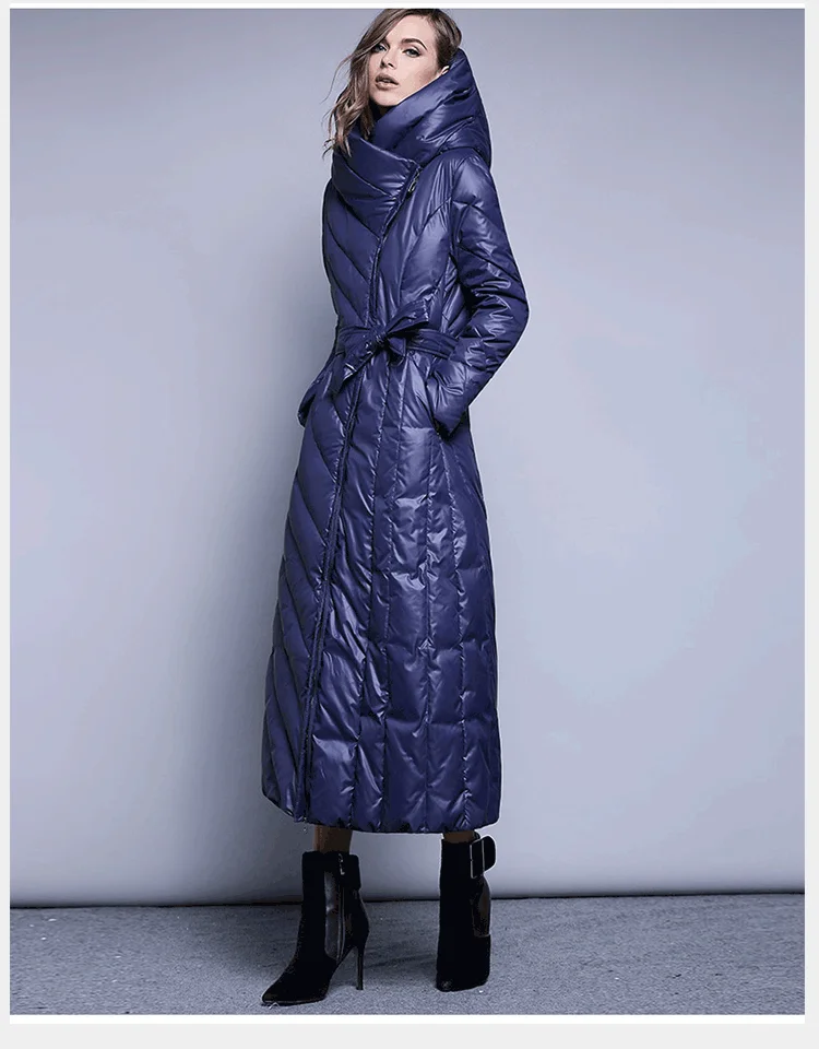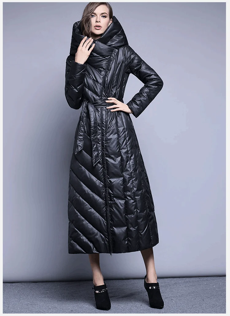 Пуховик женский, на белом утином пуху, длинный, тонкий, плотный