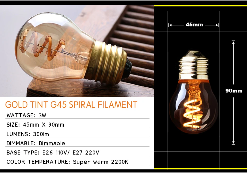 Страна: UK Emitting Color: G95 2200K Color: Spiral Gold Tint Wattage: 3W E27 220V Support Dimmer: Yes Доставка: Standard Shipping 15.06.2021