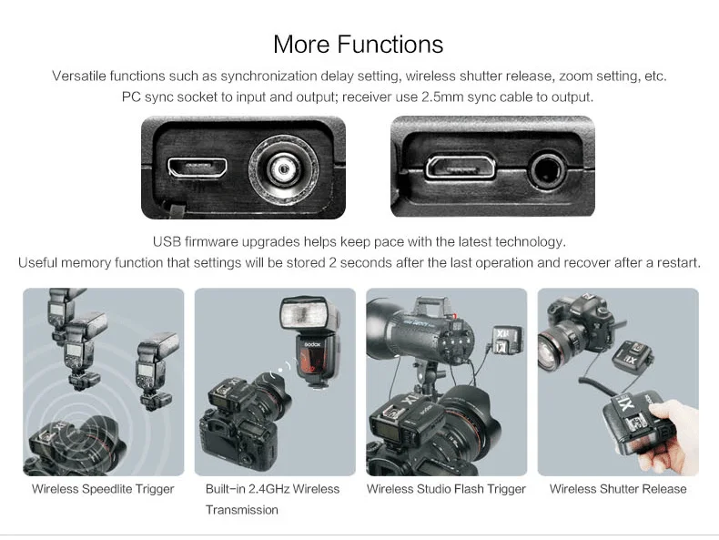 Беспроводная Функция: в режиме TTL, коэффициент выключения; В режиме M, коэффициент вспышки (A B C); Поддержка GR (Группировка вспышки)