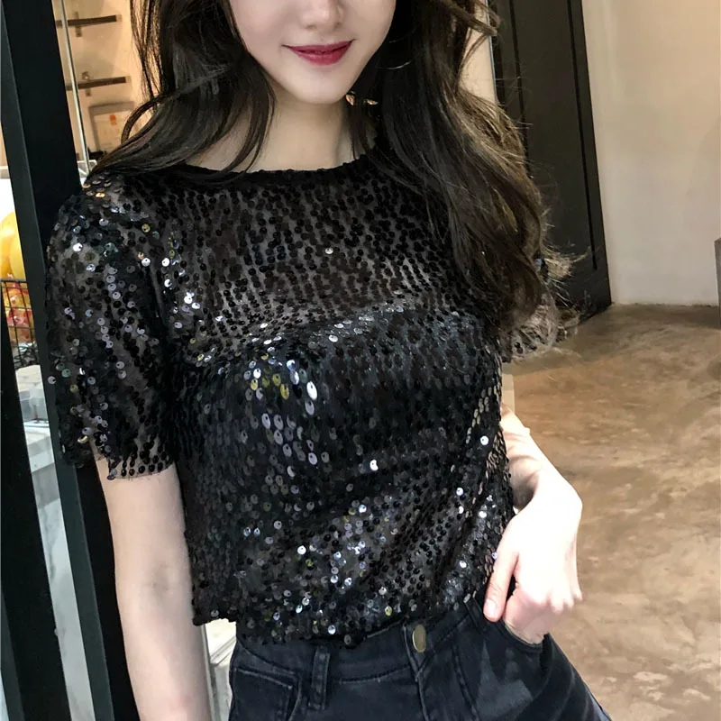 Женская блузка с коротким рукавом, круглым вырезом и блестками