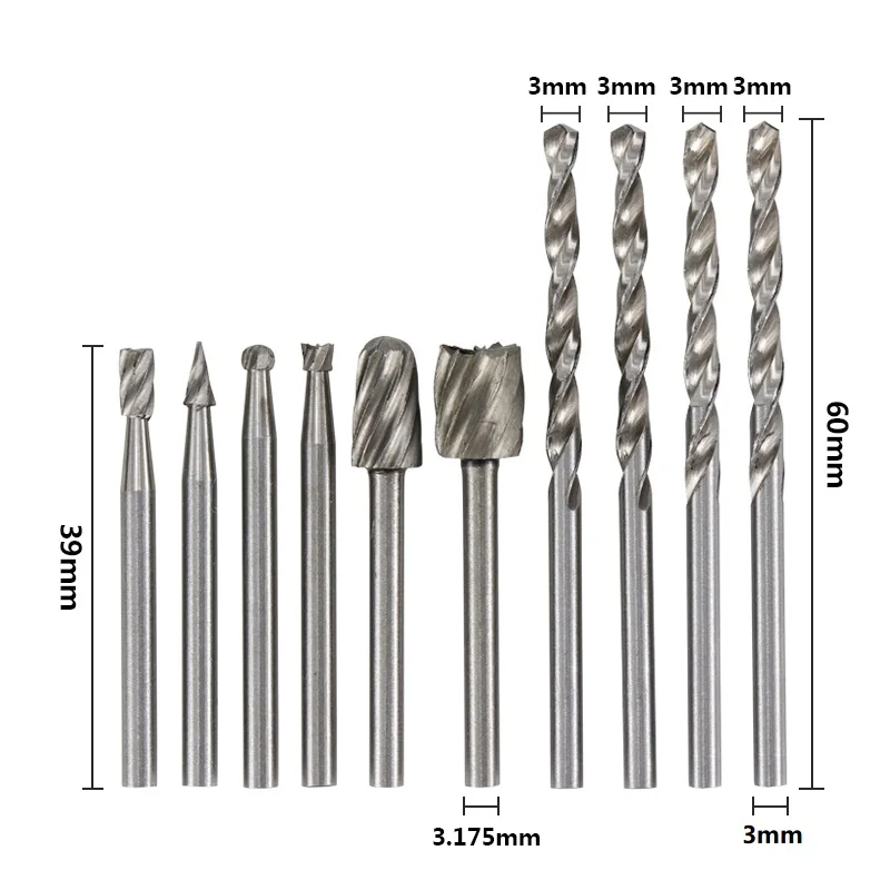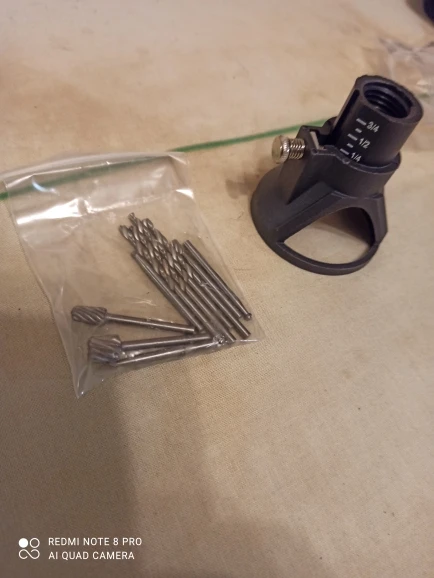 Хороший набор за приемлемую стоимость. Из эксплуатации, скажу так. Две пластиковые детали фиксируются стопорным винтом, при этом на мой взгляд не всегда 100% по горизонту. Другими словами - рассчитывать на супер фрезер не стоит, но при некоторых работах данная насадка мне пригодилась. Сверла и шарошки похожи на "hhs", заточены нормально, по количеству соответствует описанию. Комплект рекомендую, мне понравился. Магазину спасибо, будем дружить!