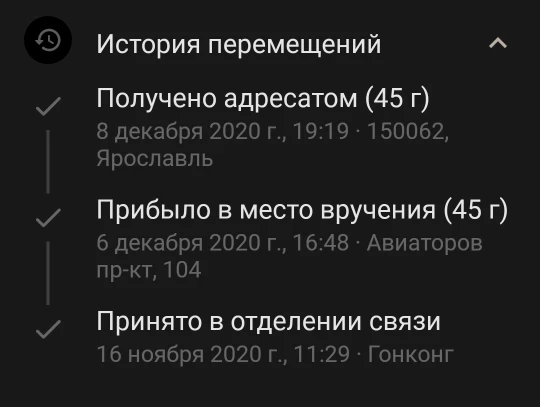 13 ноября заказал, 16 трек уже бился. 6 декабря посылка была доставлена в отделение почты. мне удалось взять его за 50р. За 50 это просто космос, за 250 просто отличный провод. брал его, так как обычные не проделали в прорезь чехла телефона, и всегда приходилось, либо сдёргивать край, либо что-то другое придумывать.