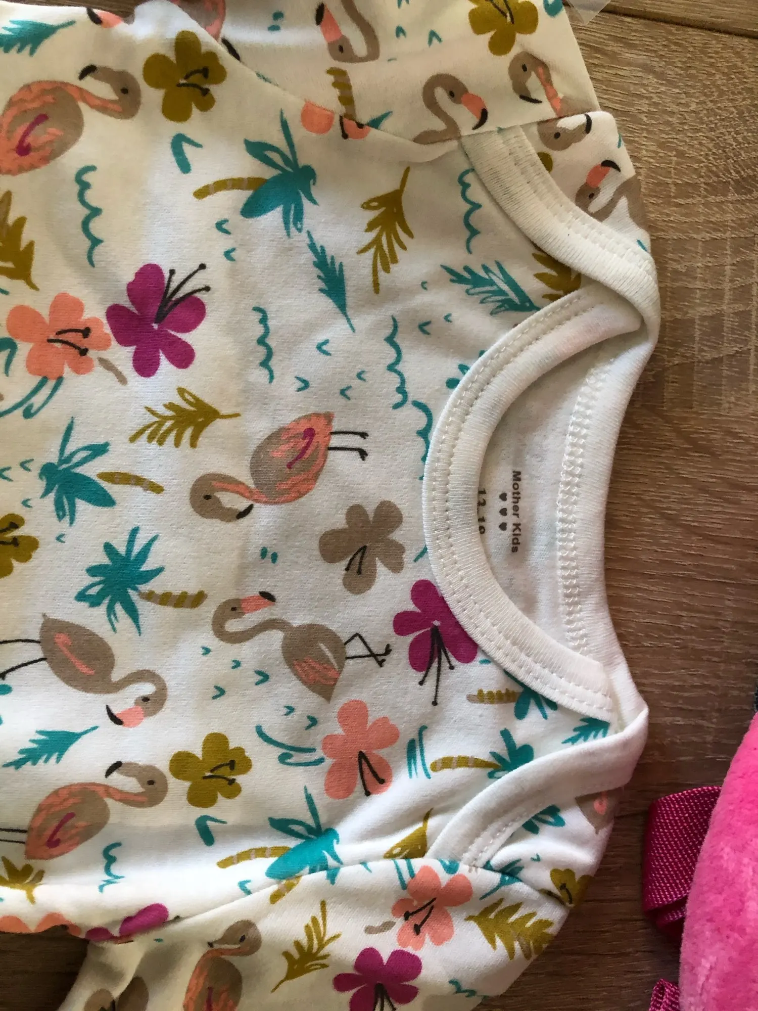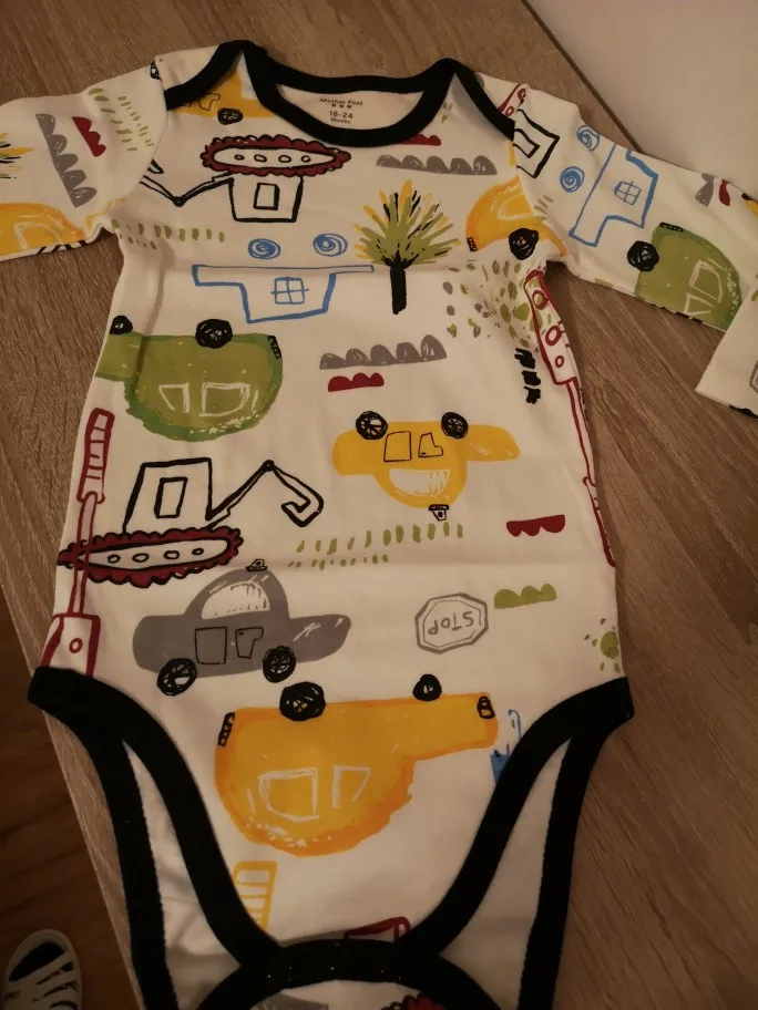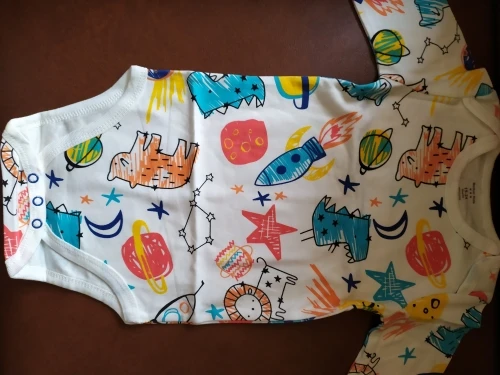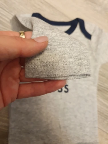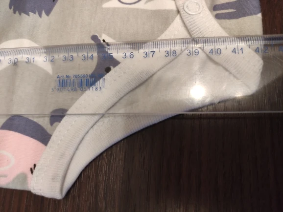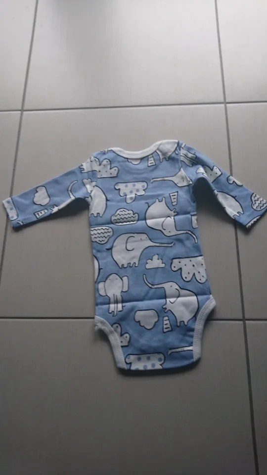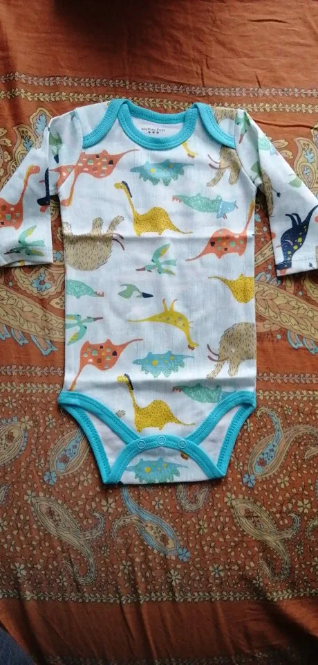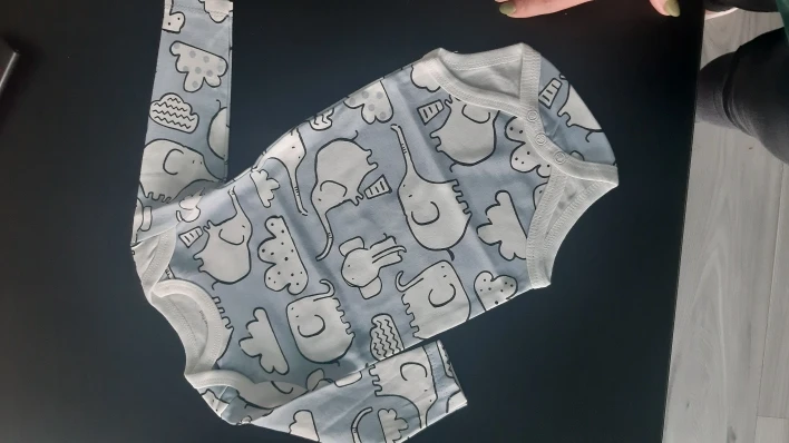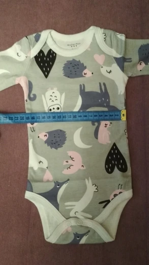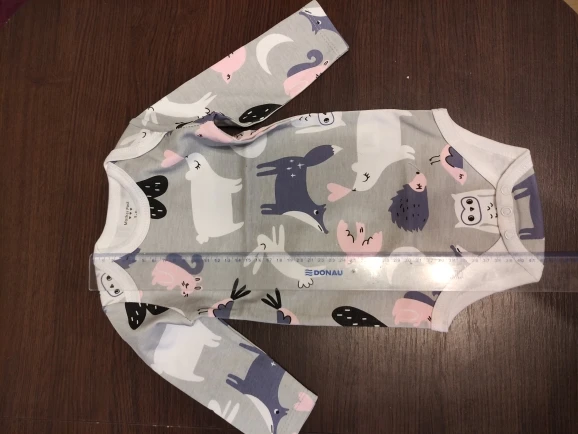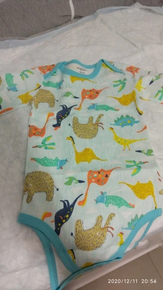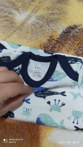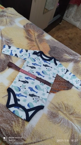 Трикотаж хороший, плотненький. Пошито хорошо. Кнопочки работают. Но маломерит мне кажется. Брала на 3-6 м. Длина изделия 43 см. Наверное ближе с рождения до 3х по размеру. Присутствует достаточно сильный запах. Цветом беднее, чем на картинке.