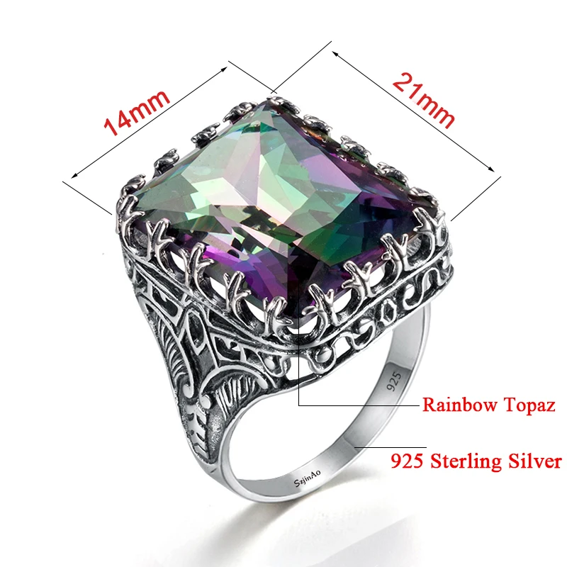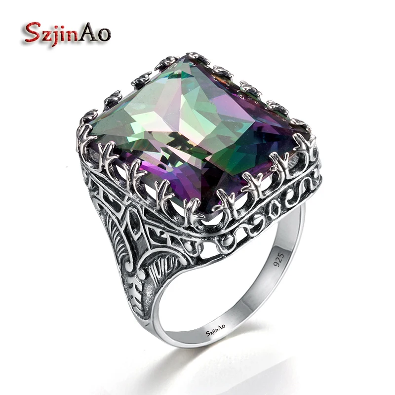 Женское серебряное кольцо Szjinao в стиле K-POP, широкое Винтажное кольцо в стиле панк с мистическим радужным топазом из настоящего 925 пробы