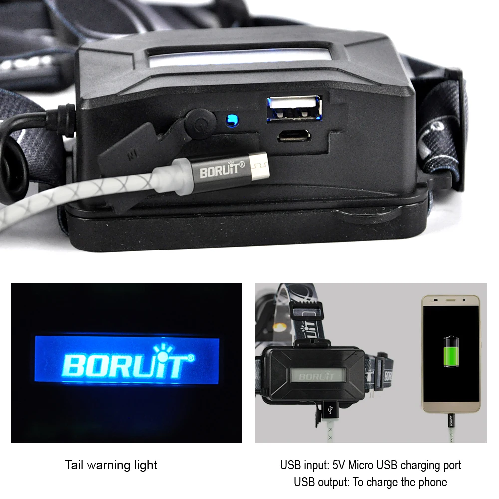 Налобный фонарь BORUiT B13 XM-L2, светодиодный, 18650 люмен, 3 режима, перезаряжаемый, с аккумулятором, водонепроницаемый