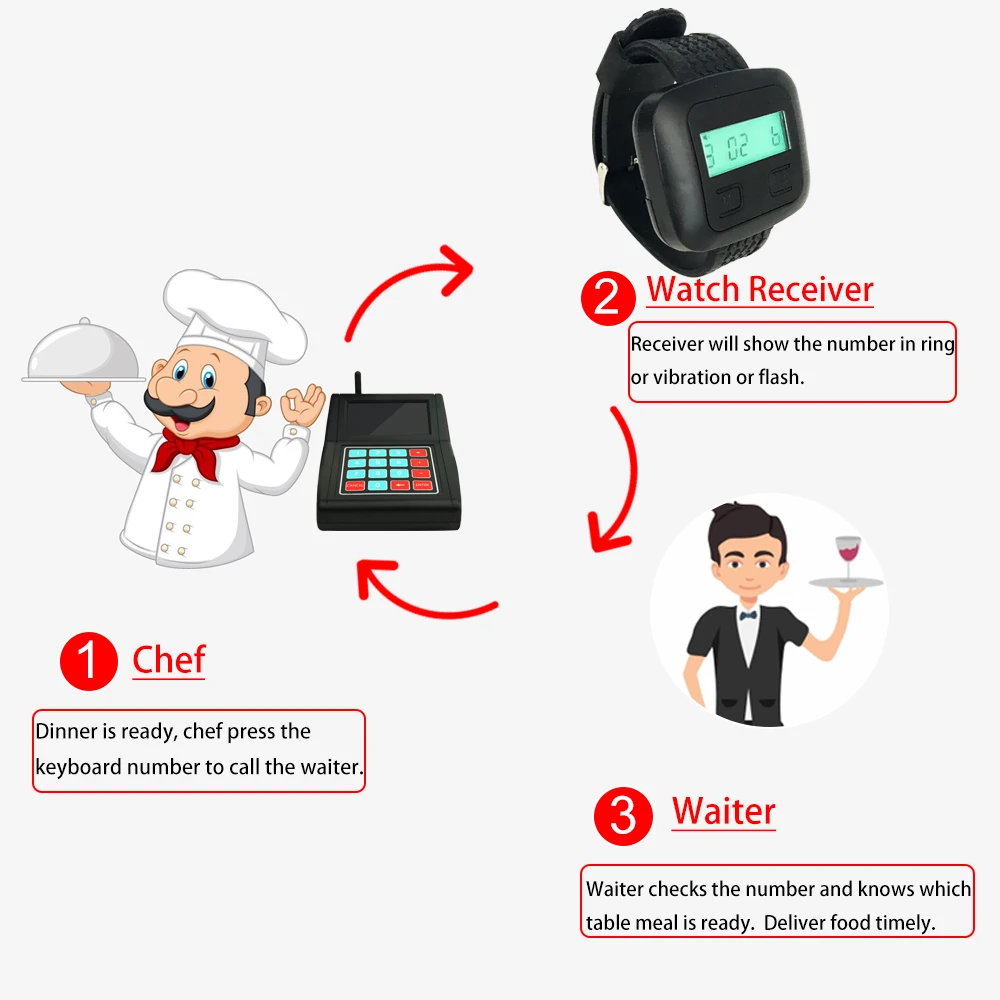 После установки смотреть пейджер и клавиатуры, они могли бы работать вместе. Прессы любой номер на клавиатуре, часы может получить сигнал, и показать номер, Они могут быть использованы в кухнях, когда еда готова, нажмите клавиатуры, официант, которые носят часы будут получить сигнал, и знает который Таблица Еда готова, Затем вручную еда, чтобы таблицы непосредственно.