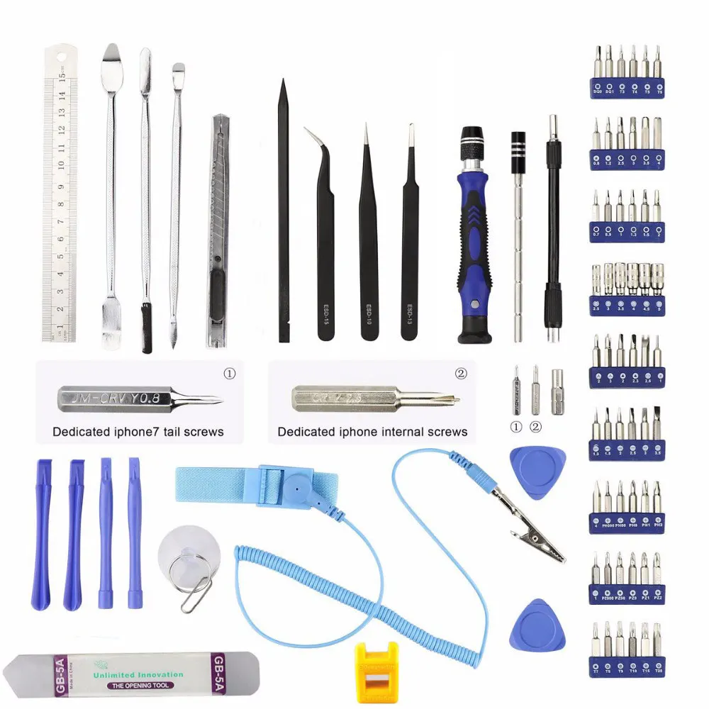 82 в 1 Набор: в комплекте 57 бит наборы драйверов, пластиковые штекеры, пинцеты, штекеры, треугольный медиатор, намагничиватель, зонд, хозяйственный нож с выдвижным лезвием, металлическая прямая Линейка, присоска, эжектор сим-карты, антистатический ремешок на запястье, нейлоновый чехол.